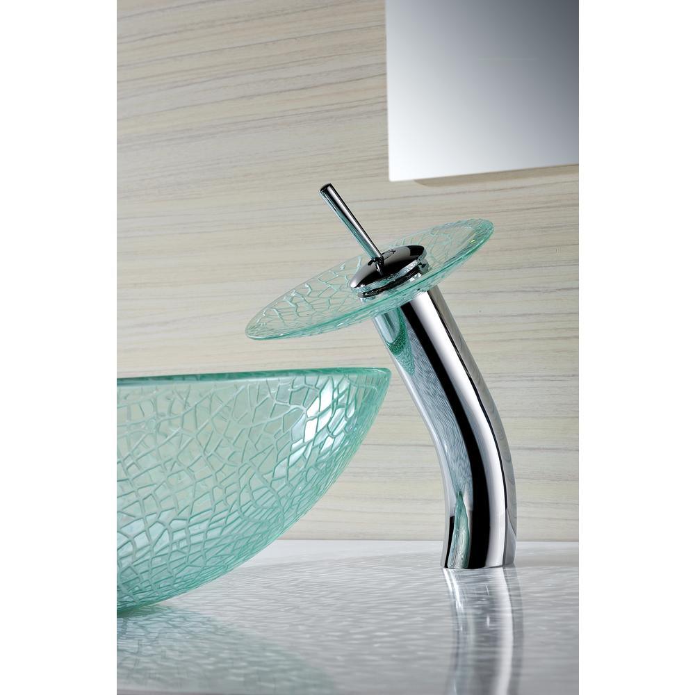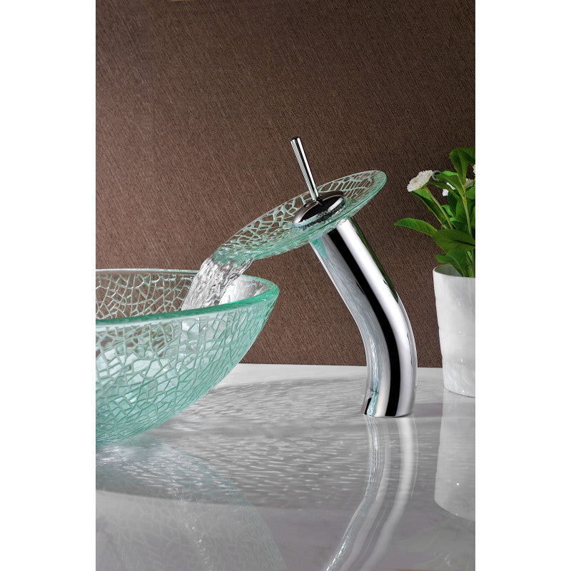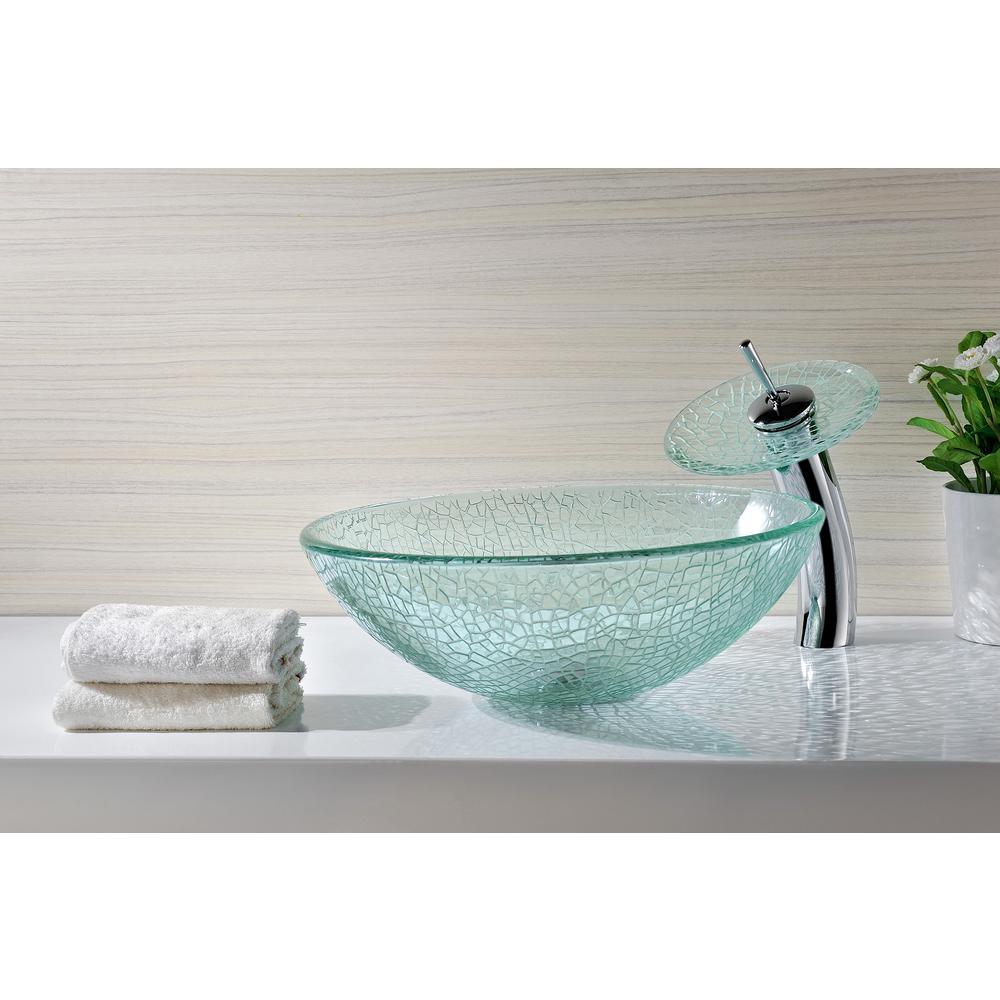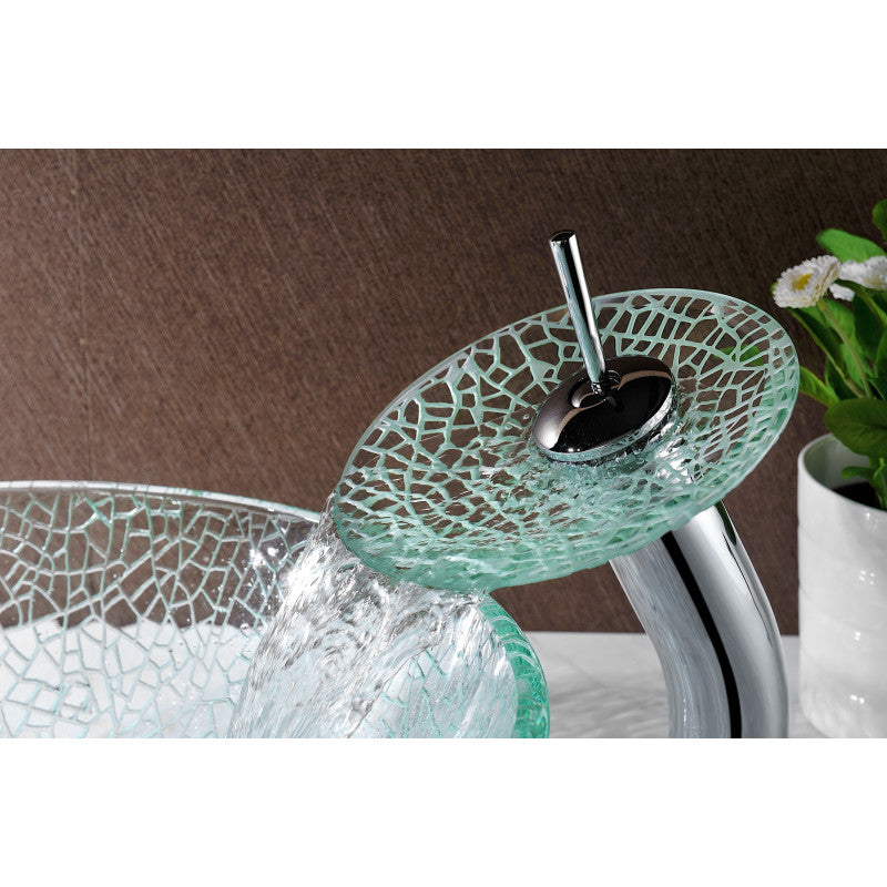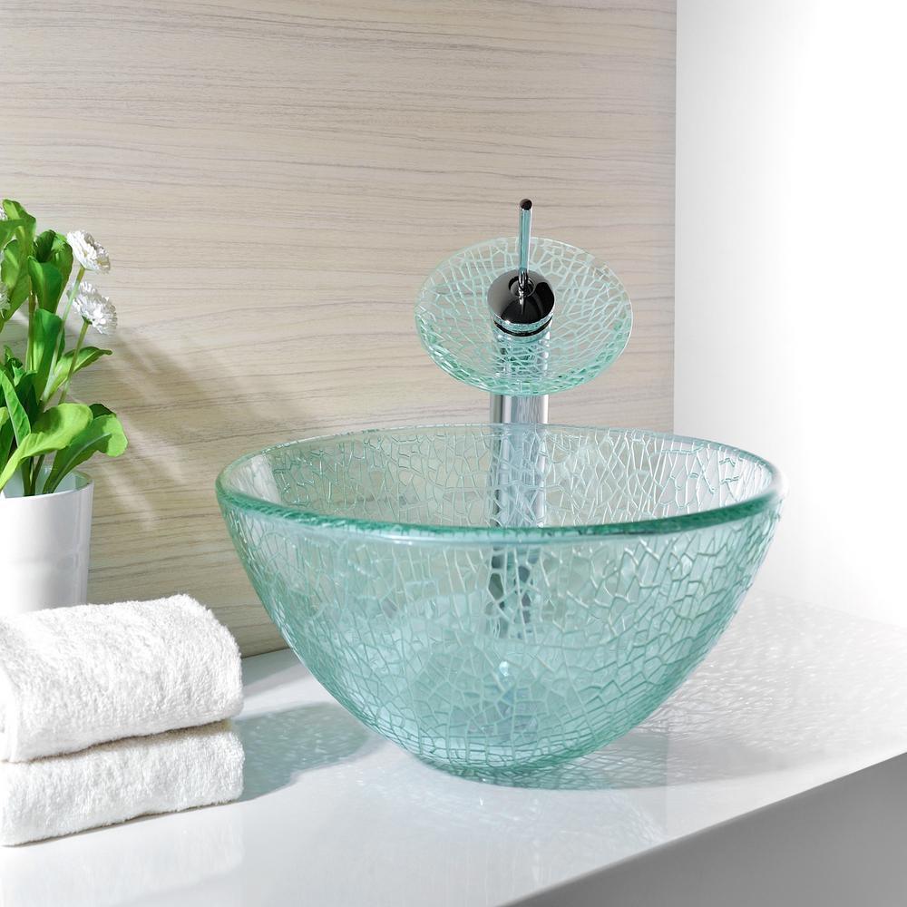 ANZZI Paeva Deco-Glass Vessel Sink in Crystal Clear Chipasi with Matching Chrome Waterfall Faucet, 16.5 x 5.75 in