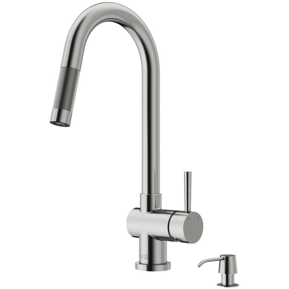 A retractable spout with a 30 in. extendable hose is discretely concealed in the VIGO Gramercy Pull-Down Kitchen Faucet and Soap Dispenser. Modern and minimalist in design, this faucet features clean lines, a dramatic high arch, and a gooseneck spout. The pull-down sprayer kitchen faucet is made from solid brass construction and features a 7-layer plated finish that expertly repels rust, corrosion and tarnish. A matching finish in-counter soap dispenser, which can be refilled with up to 10 oz. of hand or dish soap, is included with this model.