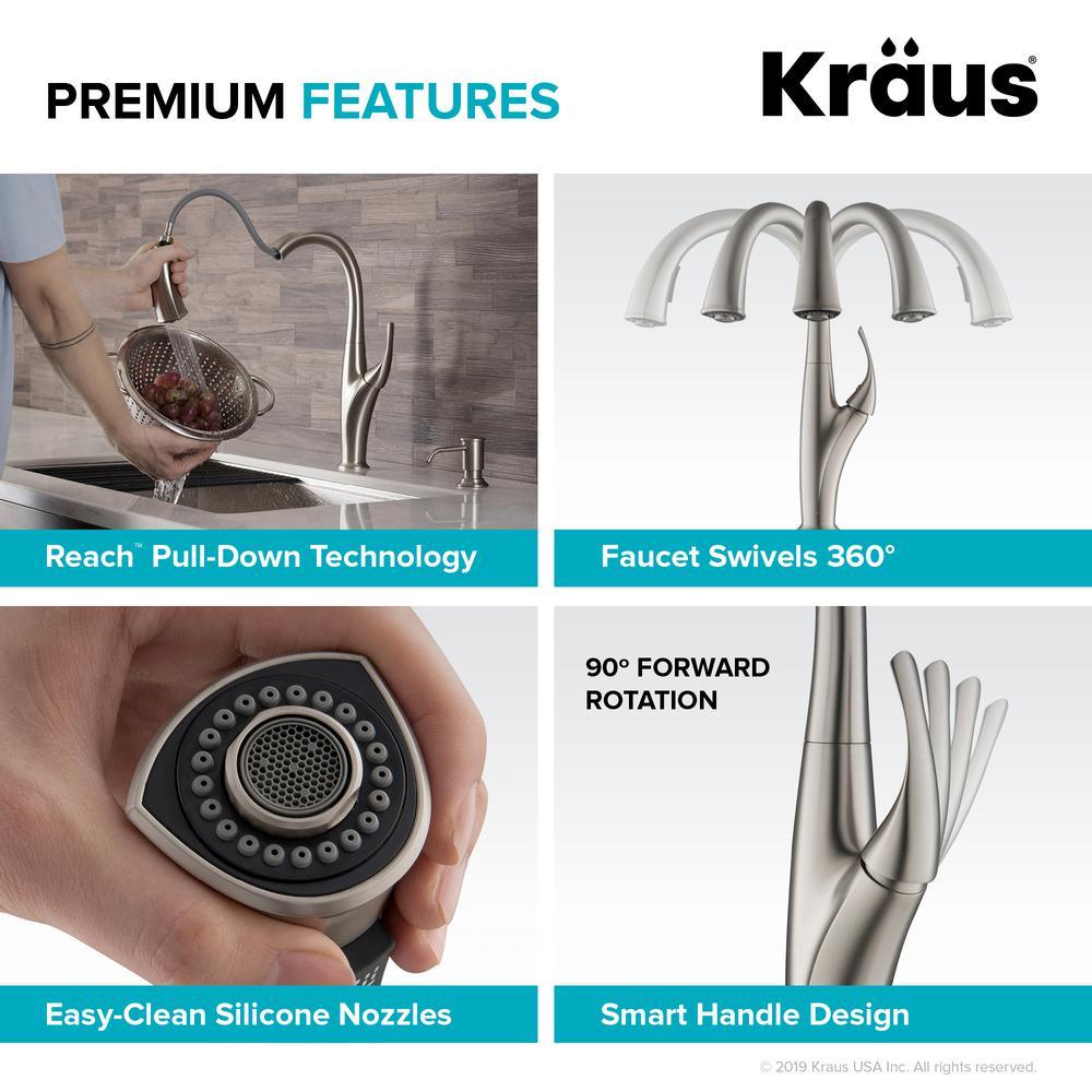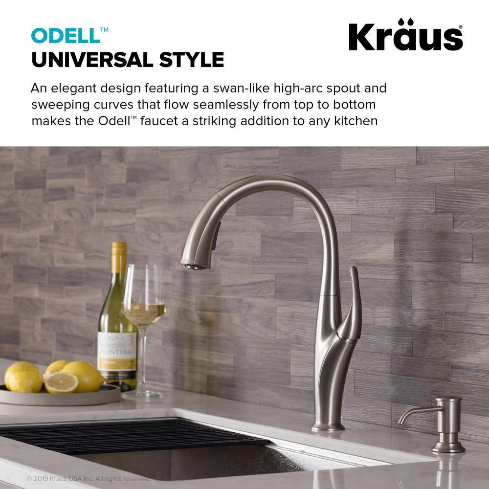 Sweeping curves and a swan-like high-arc spout make the Odell faucet a striking addition to any kitchen. The highly functional pull-down design features a dual-function sprayhead. The faucet comes with Reach technology for an extended range of motion.