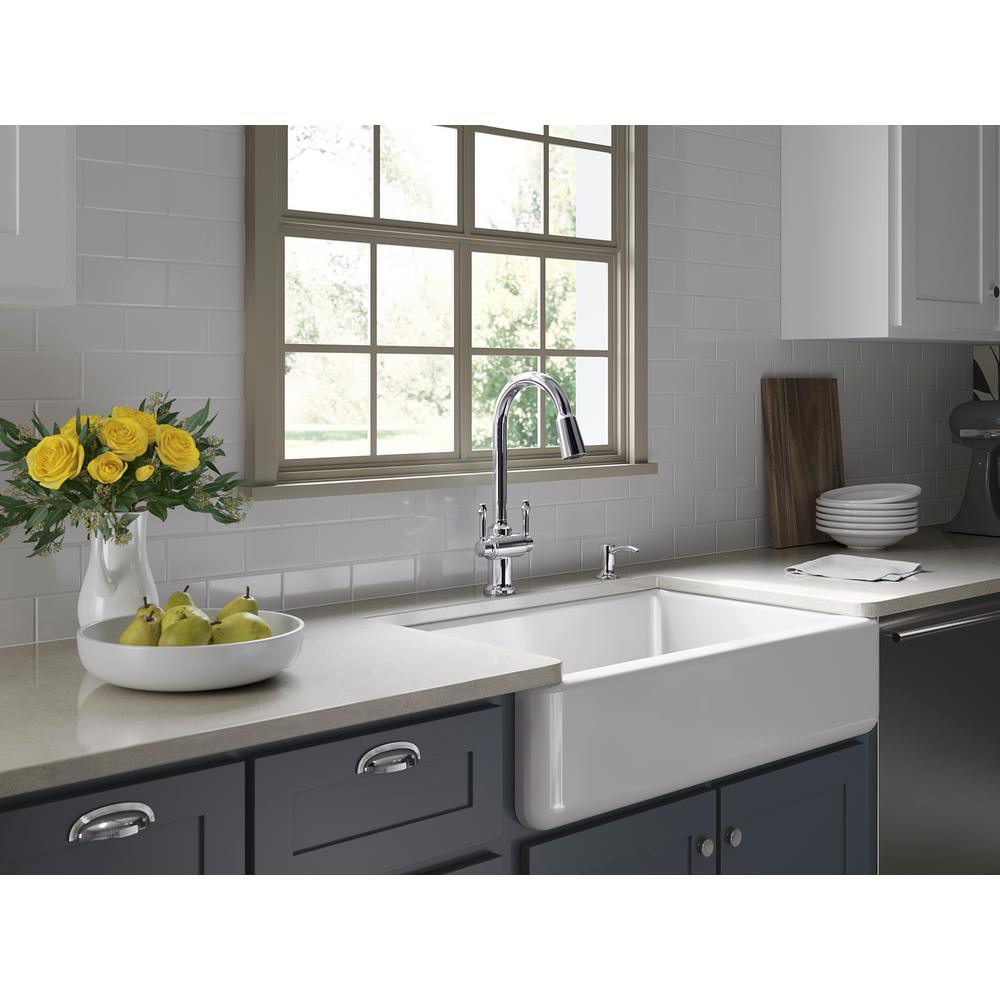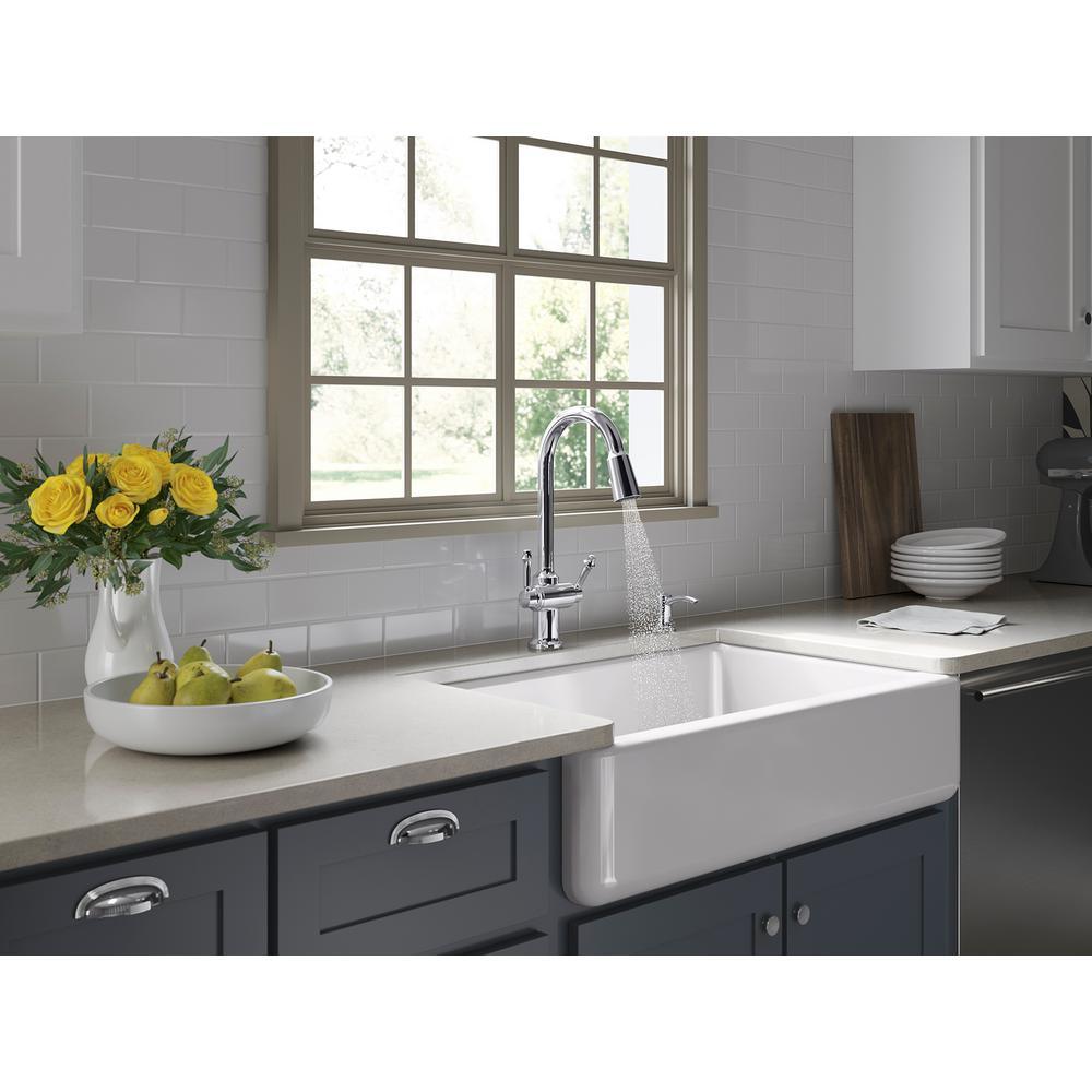 Easy to install and easy to clean, the Thierry pull-down kitchen faucet delivers a softened approach to contemporary style with its smooth, sculpted edges. The dual-spray and high-arch swing spout bring convenient functionality for the busy kitchens. It comes with a lifetime limited warranty.