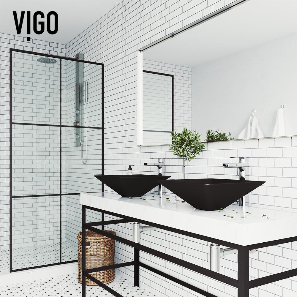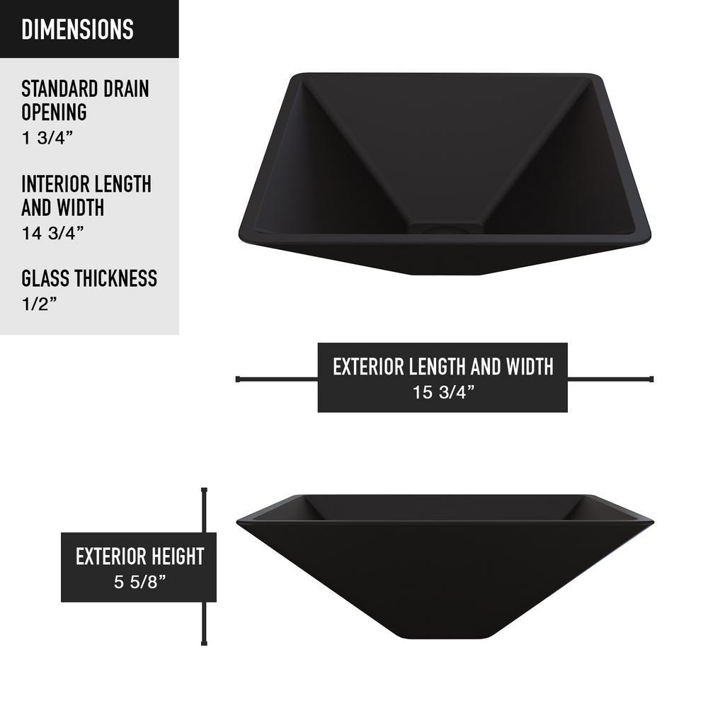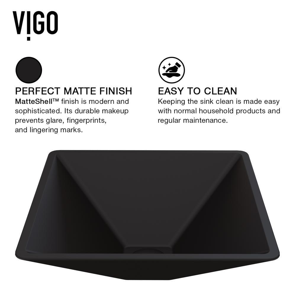 From deliberate design and pristine construction comes the VIGO Black Serato MatteShell Vessel Bathroom Sink. Innovative and intense, MatteShell sinks bring the same excellence of classic solid tempered glass sinks and take them to the next level. The Black Serato is deeply opaque and has an eggshell-like sheen that is rich yet subtle. Its deep ebony shade is infused into the sink itself, eliminating any risk of a chipped finish. The sink also has a fingerprint-free coating to prevent the appearance of marks. The distinctive, inward-pitched square shape of this sink will make any bathroom a mini art gallery. Experience the synergy of character and style all in one with the VIGO Serato MatteShell.
