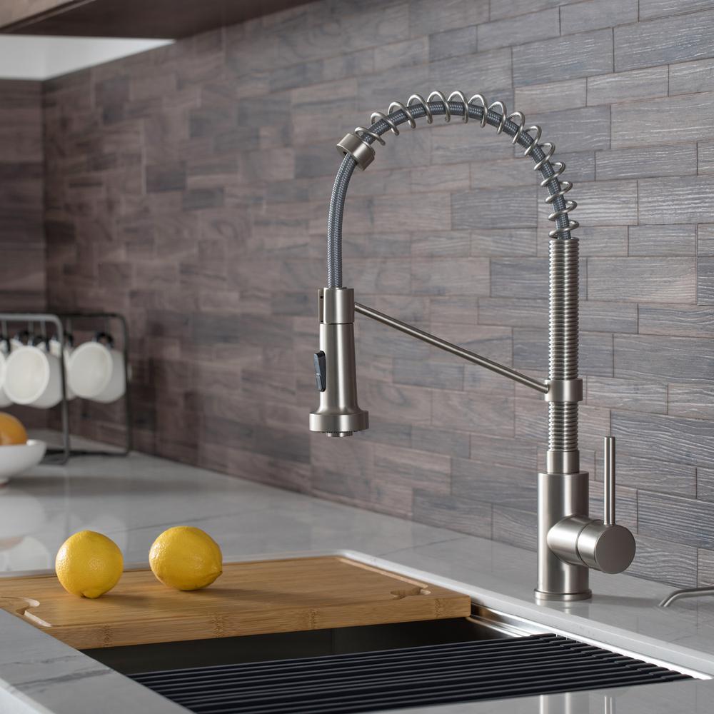 • 18 in. H commercial-style faucet optimized to fit underneath almost any kitchen cabinet; crafted from solid brass