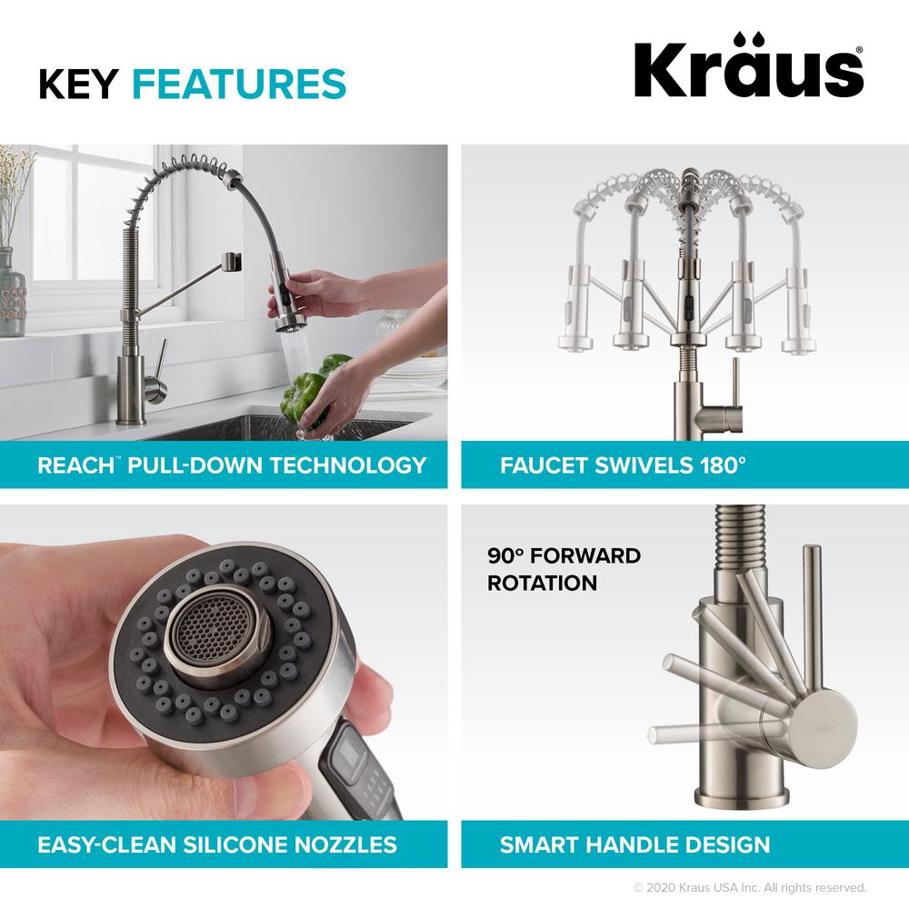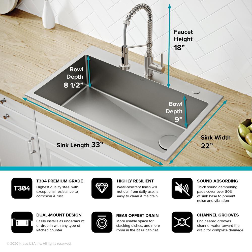 Designed with a right off-set drain, straight walls, and tight-radius corners, the Loften high-capacity stainless steel sink will add a contemporary feel to your kitchen. Convenient dual mount configuration allows you to install it as an undermount or top mount with any type of kitchen counter. Handcrafted from high quality T304 stainless steel with gently sloped bottom and creased channel grooves that allow for superior drainage. Comes paired with a commercial style pull-down faucet with 16 in. reach for a cohesive look and optimum efficiency