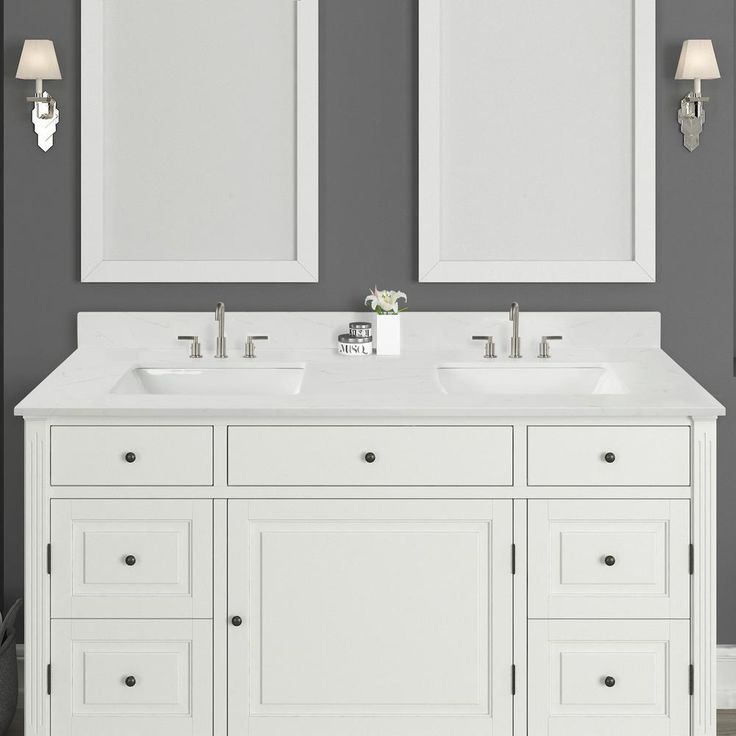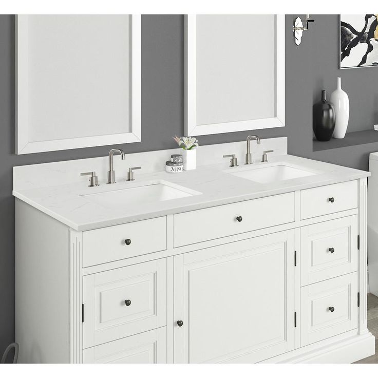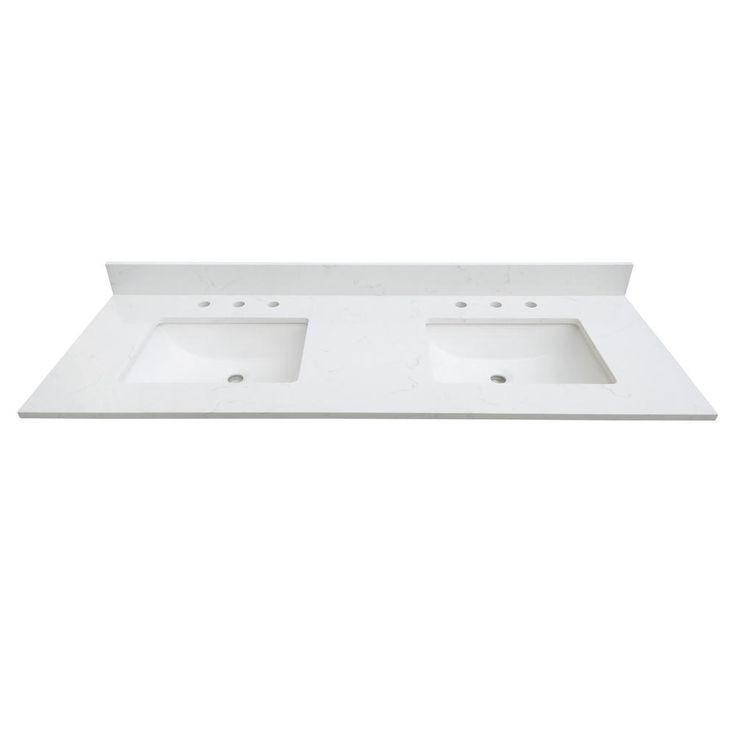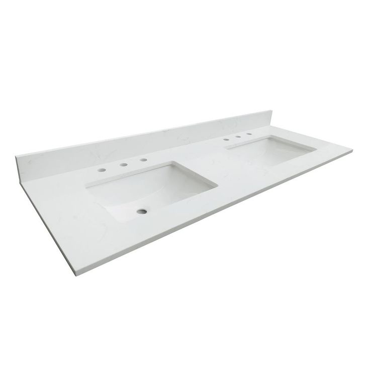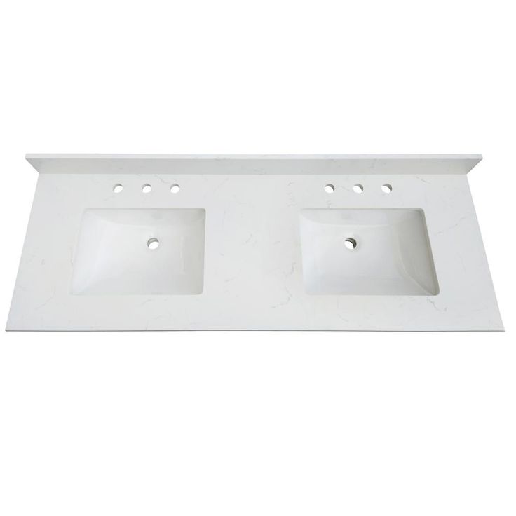 73 in. Carrara White Quartz Top. Attached two stylish rectangular white vitreous china undermount bowls with safety overflow hole. 4 in. high backsplash included to help protect walls from water damage.