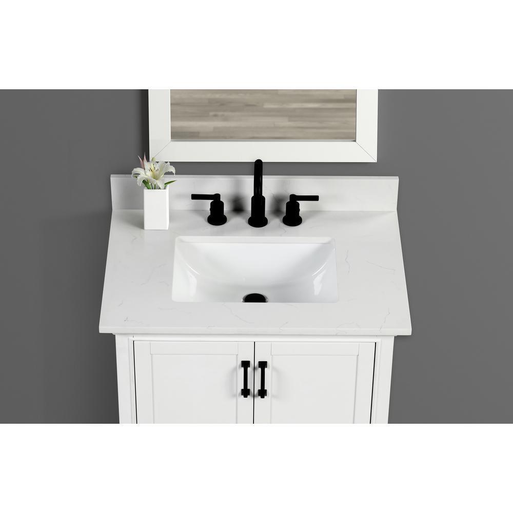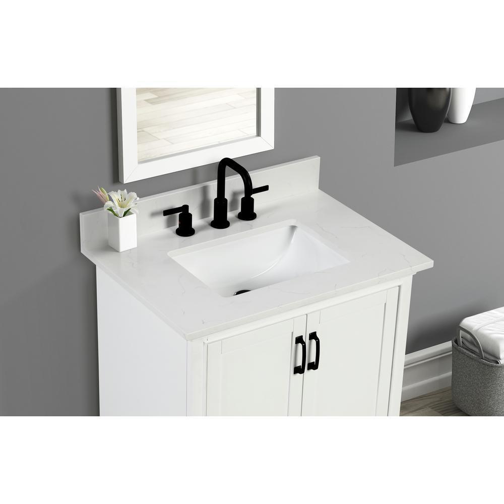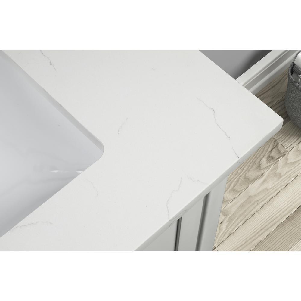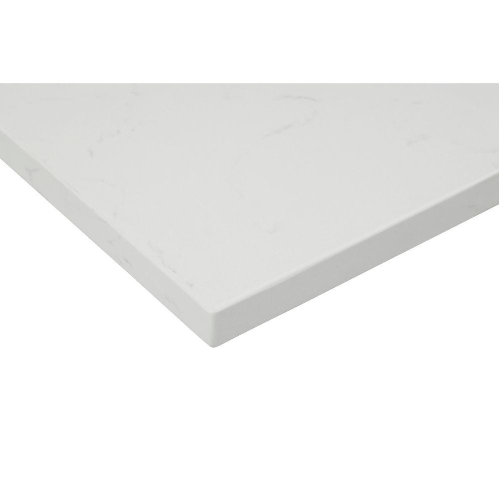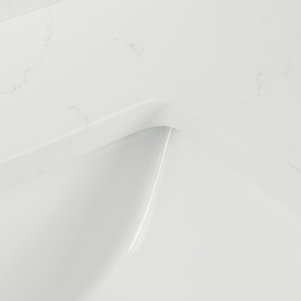 37 in. Carrara White Quartz Top. Attached stylish rectangular white vitreous china undermount bowl with safety overflow hole. 4 in. high backsplash included to help protect walls from water damage.
