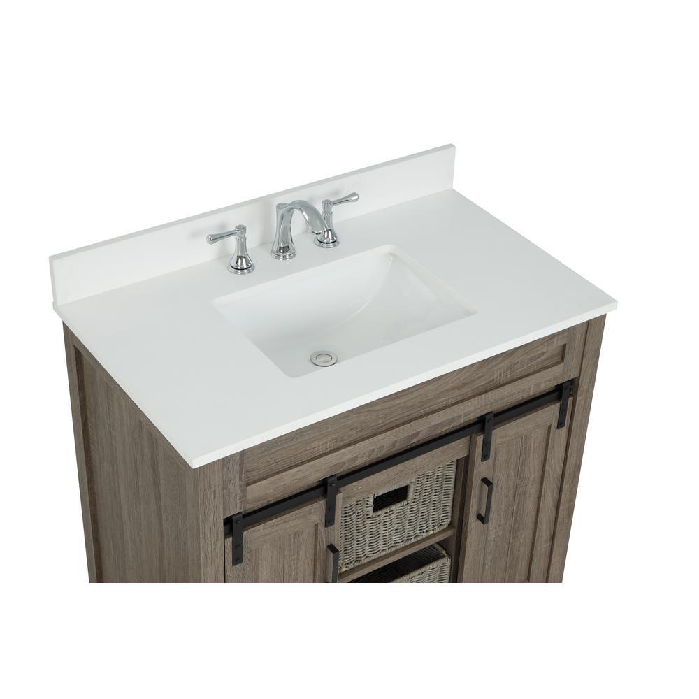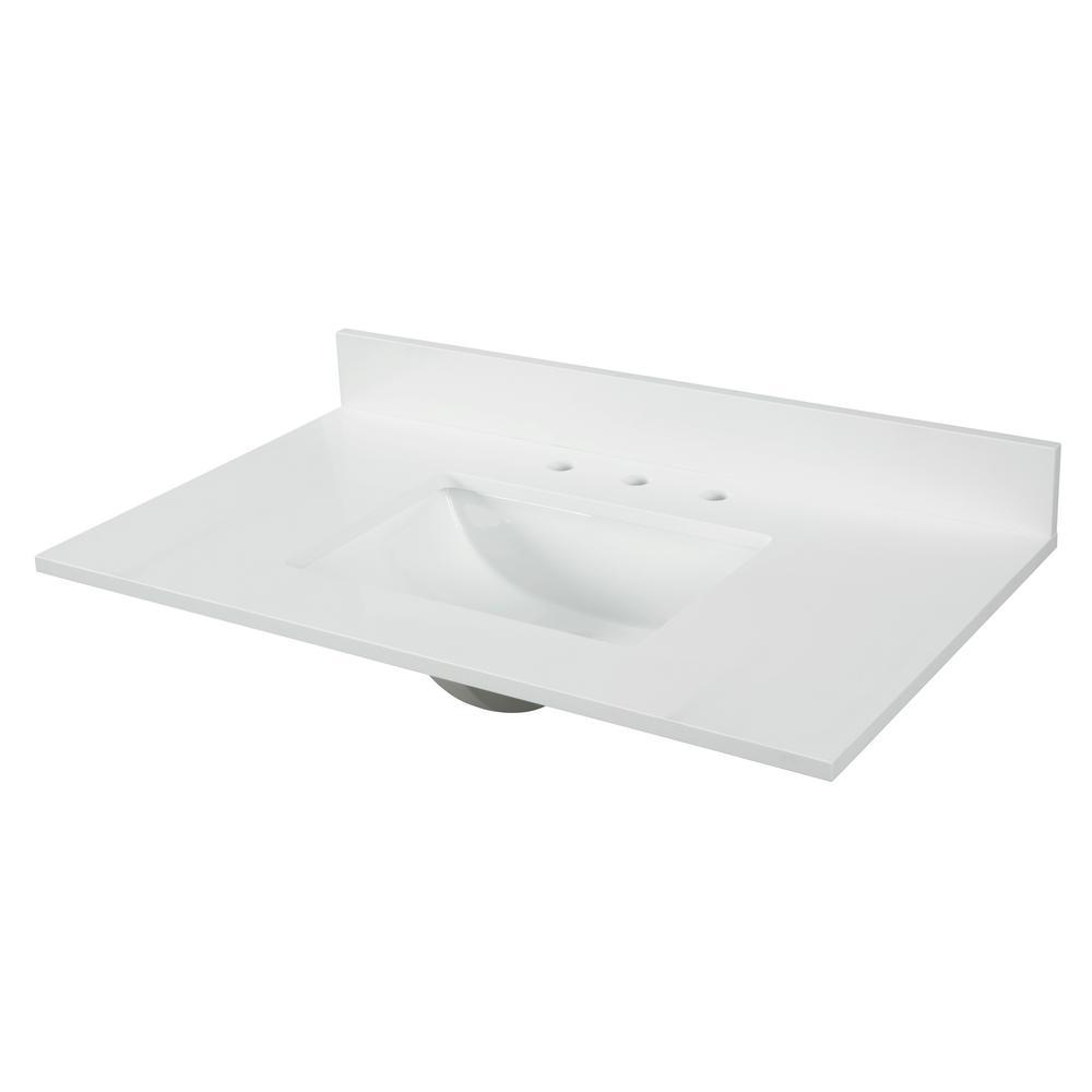 31 in. Snow White Quartz Top. Attached stylish rectangular white vitreous china undermount bowl with safety overflow hole. 4 in. high backsplash included to help protect walls from water damage.