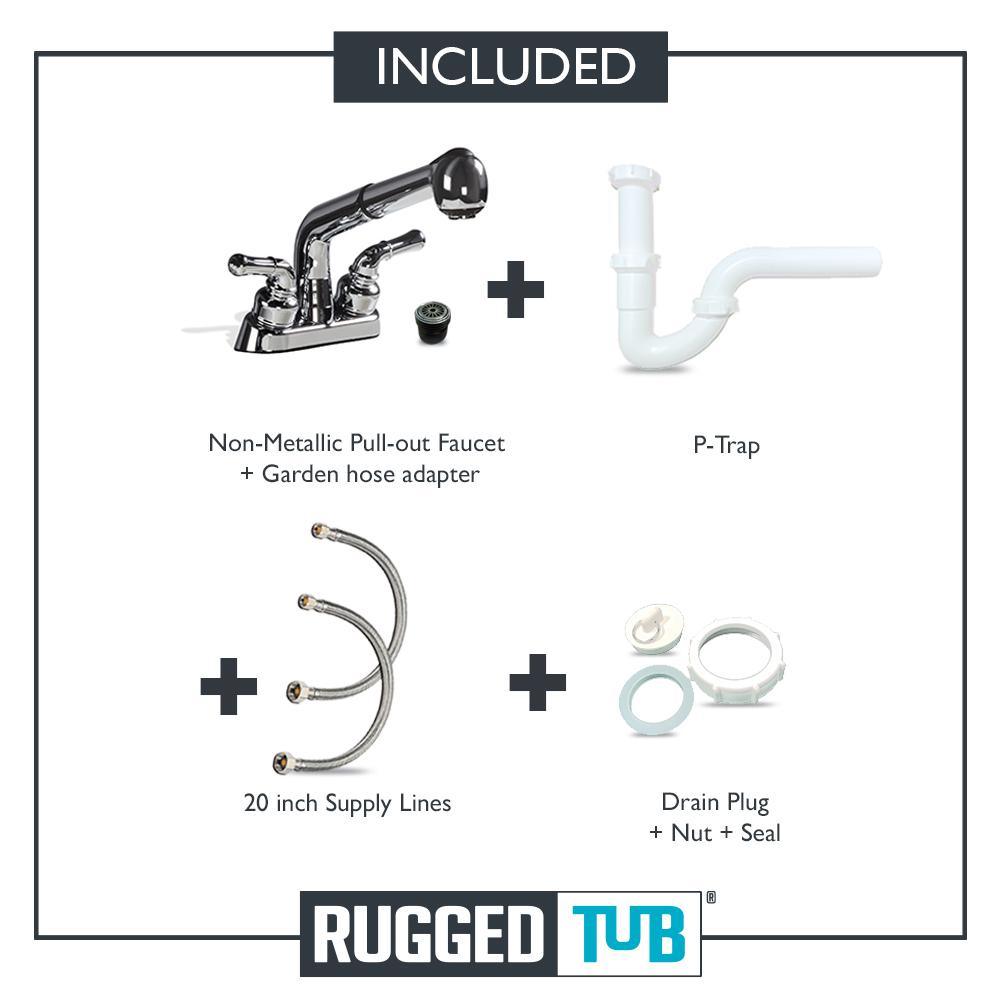 Include a black 18 in. (N52B) laundry tub and a cUPC approved non-metallic pull-out chrome faucets with stainless steel speedways, plastic P-Trap, garden hose adaptor and hardware kit. Black laundry tub made of 100% recycled material. Includes Non rust adjustable feet/legs. All RuggedTub sinks accommodates a single or dual-handled faucet with 4 in. or 8 in. centers and perforated markers underneath the sink for easy installation of a faucet. We suggest using a knife to weaken the plastic first then knock out each hole for the faucet.