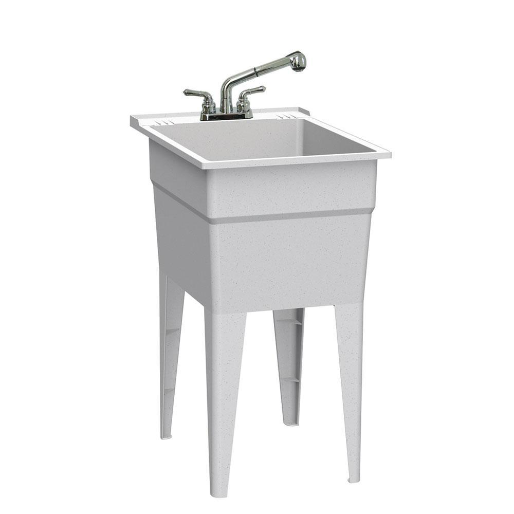 Includes a granite-grey 18 in. (N52G) laundry tub and a cUPC approved non-metallic pull-out chrome faucets with stainless steel speedways, plastic P-Trap, garden hose adaptor and hardware kit. 100% Virgin Polypropylene Materials. Non rust adjustable feet/legs. All RuggedTub sinks accommodates a single or dual-handled faucet with 4 in. or 8 in. centers and perforated markers underneath the sink for easy installation of a faucet. We suggest using a knife to weaken the plastic first then knock out each hole for the faucet.