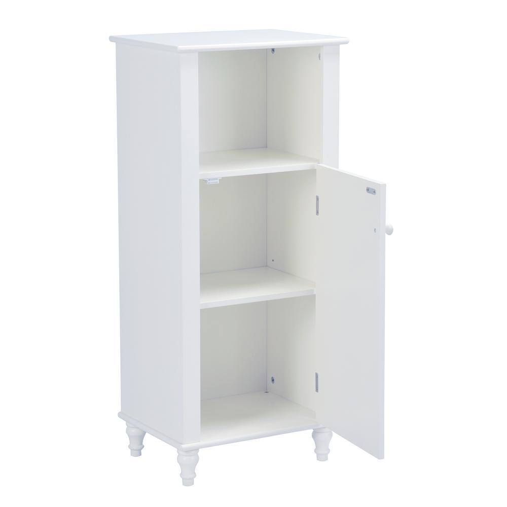 Add an element of style to your bathroom decor with the refined simplicity of the Cary IV side cabinet. With this modern bath cabinet, you can instantly expand your bathroom storage space. This striking rectangular cabinet showcases an open cubby shelf which is great for storing candles. Behind the hinged door you will find ample out-of-sight storage space. A smooth white coating with solid wood carved legs and a durable MDF wood design will complement your space for a long time.