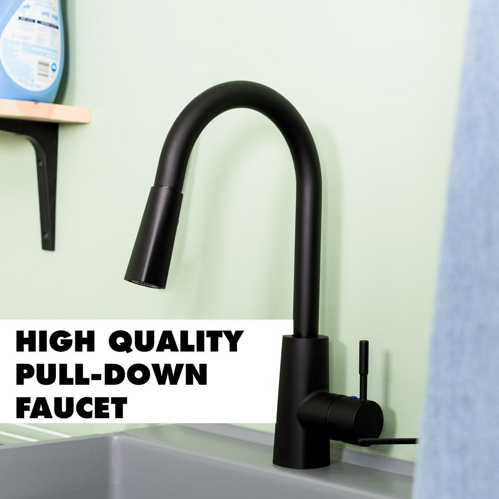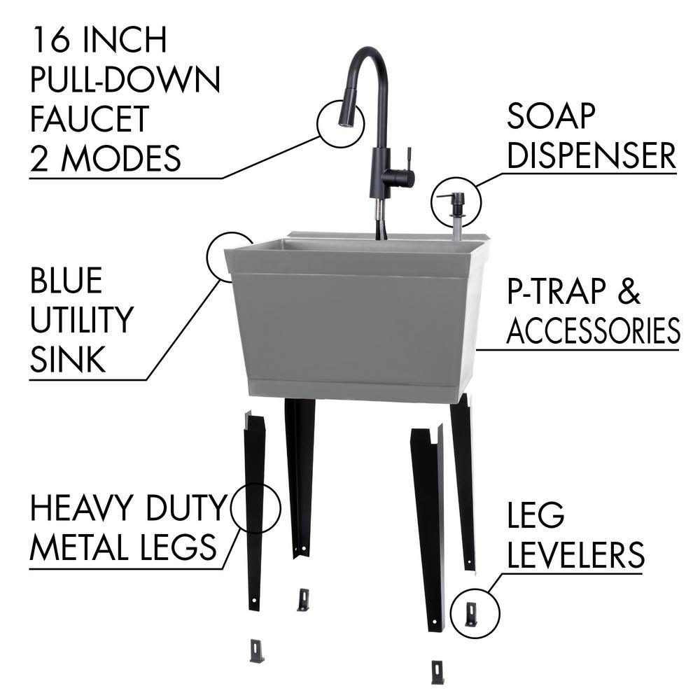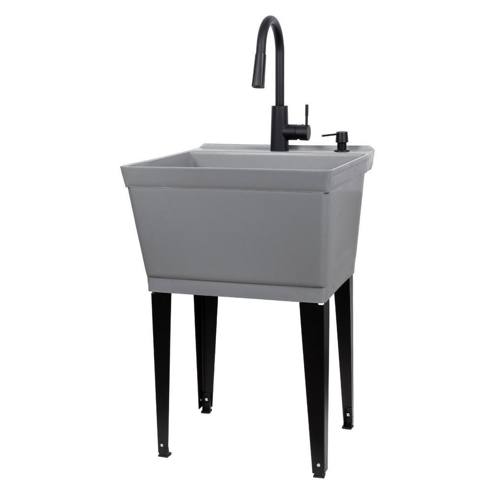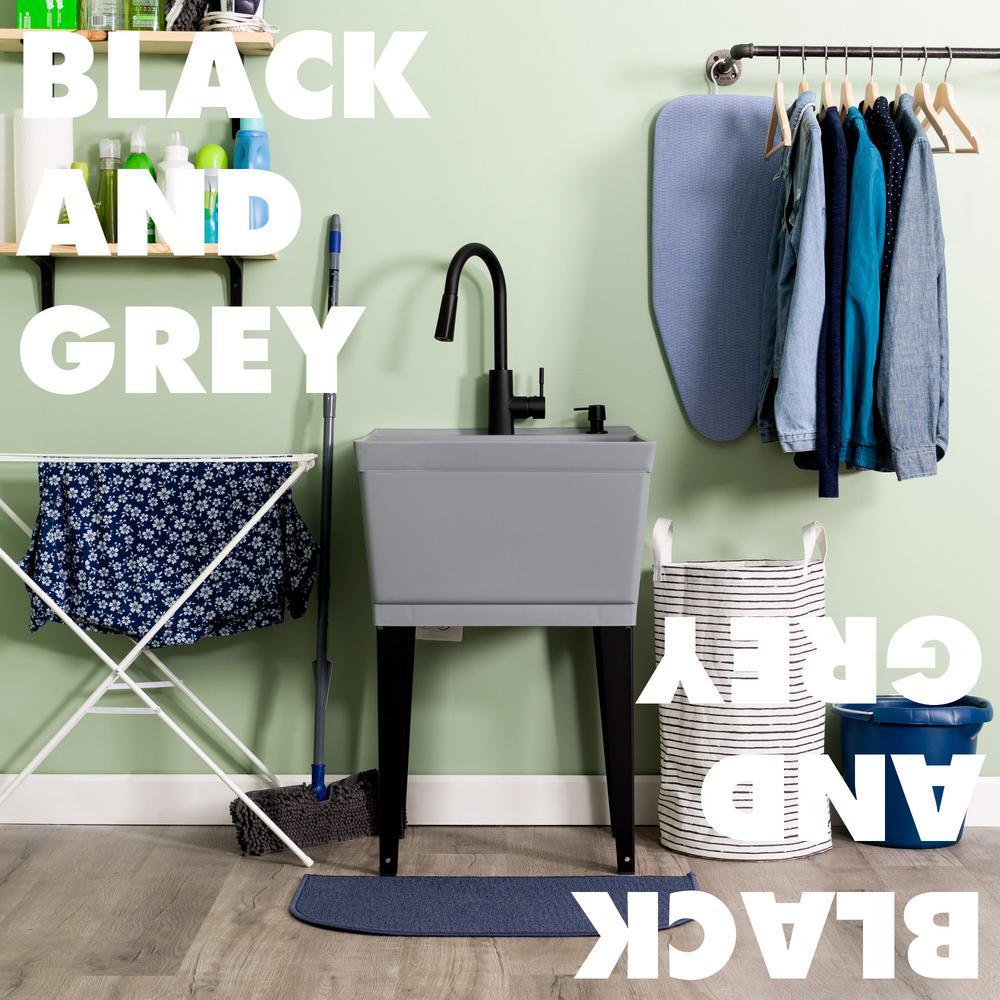 Our classic grey utility sink, paired with a matte black, high-arc faucet, matching soap dispenser and black metal legs will lend a stylish touch to your laundry area or utility room. This 6507 series laundry tub set comes complete with tub, high-arc pull-down faucet with integrated supply lines, soap dispenser, metal legs, rubber stopper, p-trap, floor levelers, hardware, and installation instructions. The stylish pull-down faucet features a two-function spray or stream option and perfectly matches the soap dispenser and legs. The tub is made of high-quality durable thermoplastic construction and features a stain-resistant wipe clean surface. Sturdy rust-proof metal legs attach easily, and the included floor levelers increase stability on uneven surfaces. 1-year limited warranty.