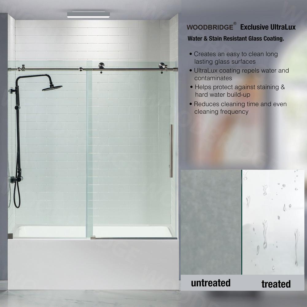 WOODBRIDGE Beccles 56 in. to 60 in. W x 62 in. H Frameless Sliding Bathtub Door with Shatter-Retention Tempered Glass, Brushed Nickel