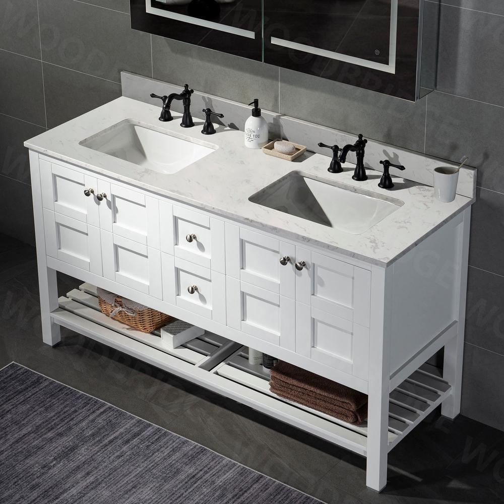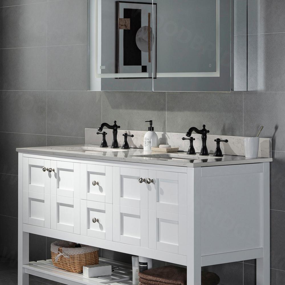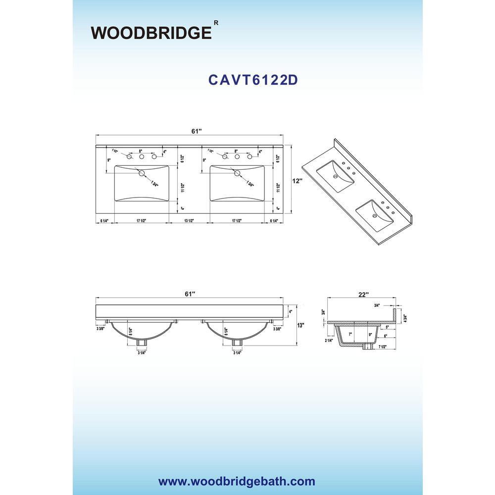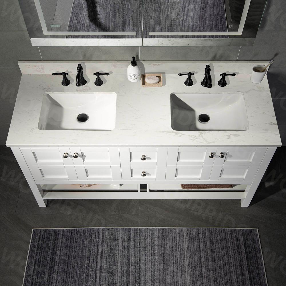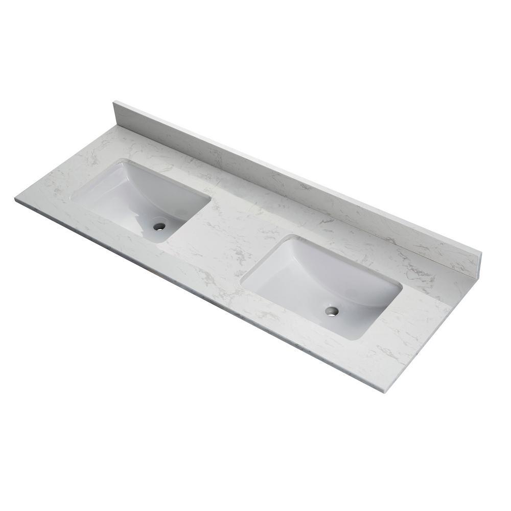 Transform your bathroom with a beautiful cultured marble vanity top with a solid white finish encompasses a quality that give your home a clean and contemporary look, this cultured marble top is easy to install and fits directly on top of any standard 60 in. vanity top. An attached 4 ft. height backsplash will help protect your wall, and the back of your cabinet, against small splashes and spills. Dimensions: Exterior Dimension: 61 in. wide x 22 in. deep. fits Most Standard 60 in. W x 21 in. D vanity cabinet, 8 in. center faucet holes Elegant and Stylish Top: Warmly elegant and stylish, Engineered Quartz Marble vanity top complement most Bathroom designs and coordinate with both light and dark cabinetry. High-end and classic natural stone top Pre-sealed and Polished for added protection. Easy to Installation: Top pre-drilled for 8 in. widespread faucet, Assembled stylish rectangular white vitreous china under mount bowl with safety overflow hole, This top is perfect for quick and easy remodels. Obtain the beauty and durability of marble without hiring a professional package included: Vanity top with assembled rectangular under mount bowl , matching 4 in. high Backsplash. Besides, extremely solid package - very firm carton box with foam is used to transport top, making sure a safe delivery.