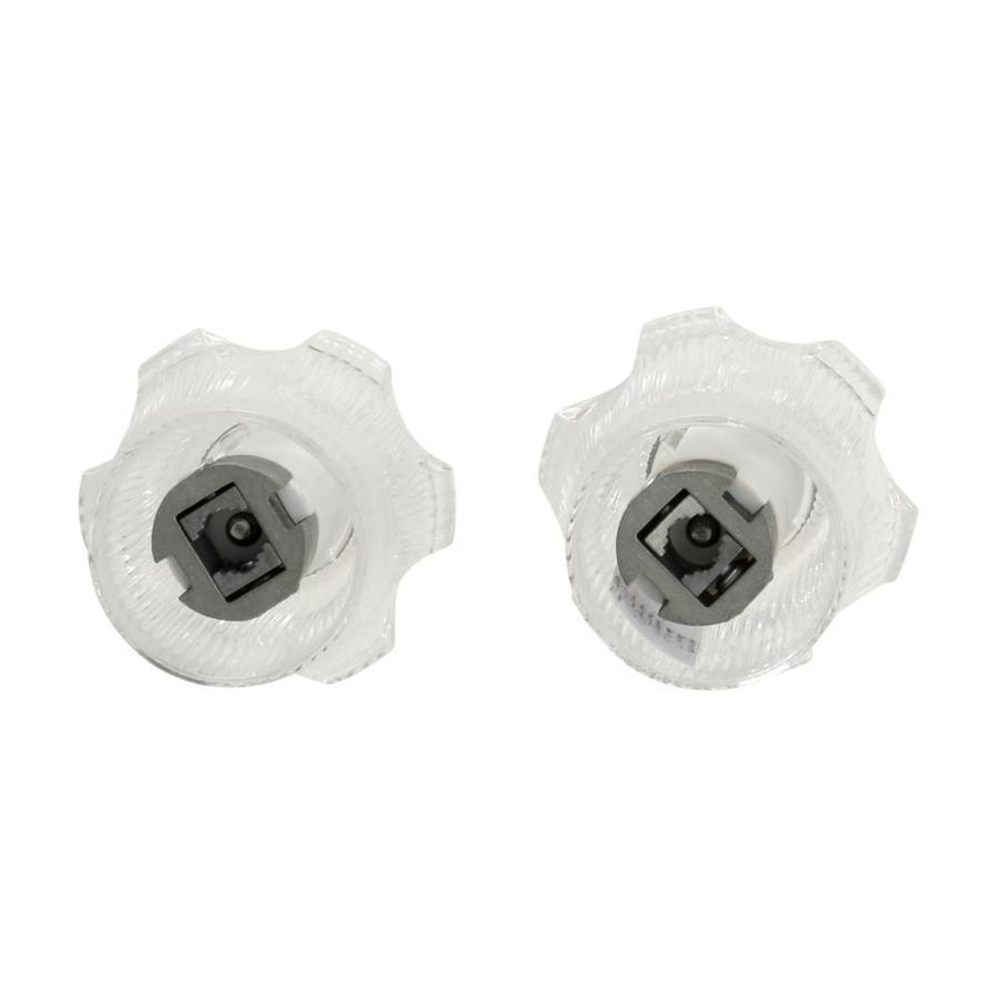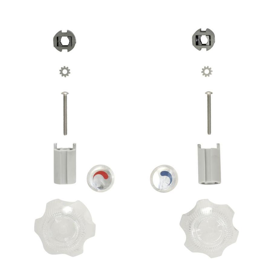 Durable clear acrylic construction also provides reliability Versatile design includes adapters to fit a variety of faucet fixtures Clear design gives a freshed look that will match moth bathroom fixtures Includes adapters, spacers and Allen wrench Spacers can be placed on top of the adapter to prevent handle from installing to close and scraping the handle flange if needed Included in packaging are a pair of handles 1-9/16 inch diameter at base; 3 inch overall height Easy to install with little tools required