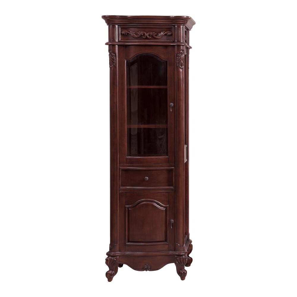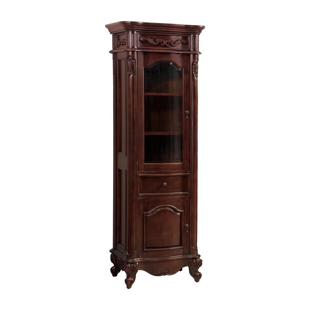 A traditional freestanding linen cabinet crafted from solid poplar with cherry veneer MDF in an antique cherry finish. Features a soft-close glass door, soft-close drawer, and adjustable levelers for stable storage in any bath.