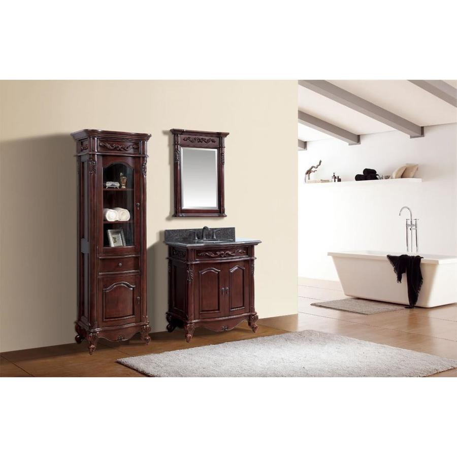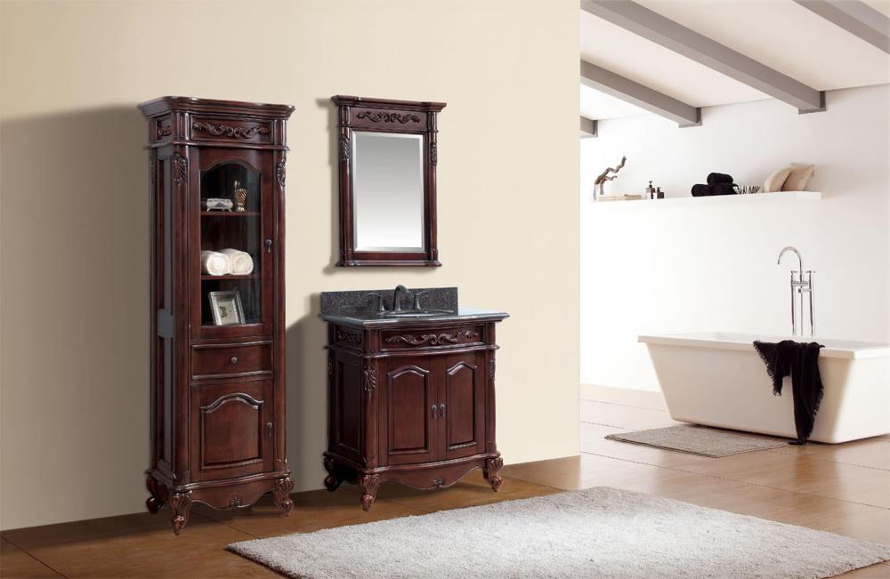 • Classic Antique Finish: Antique cherry with antique brass-finished hardware suits traditional baths