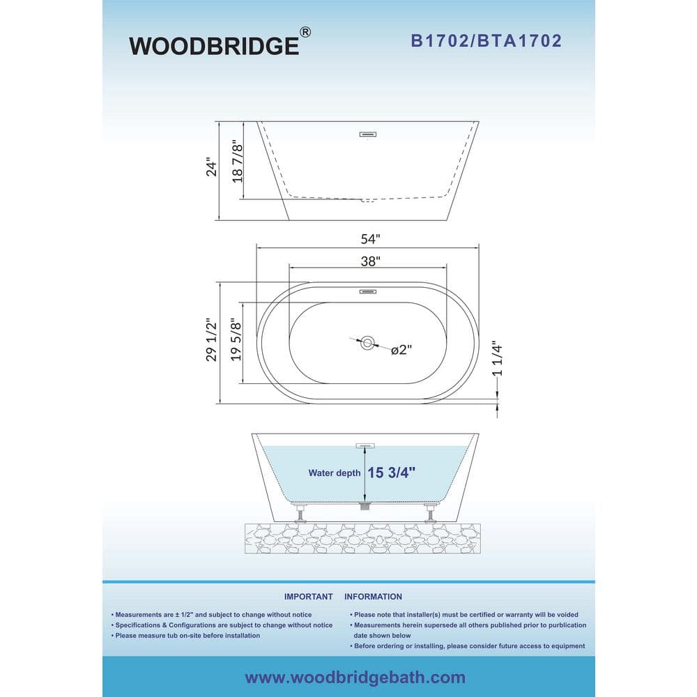 Compact yet luxurious, this WOODBRIDGE freestanding soaking tub features a double-ended oval design crafted from high-gloss acrylic reinforced with fiberglass. A polished chrome integrated overflow and matching drain are included, delivering a sleek look and leak-resistant performance for modern baths.