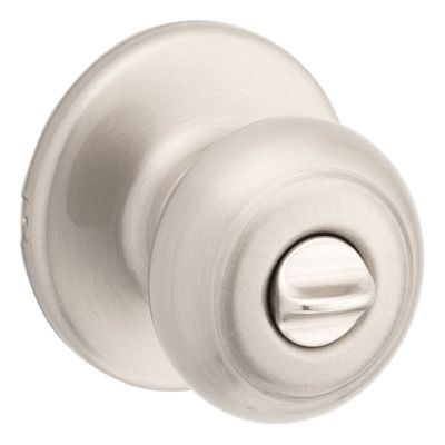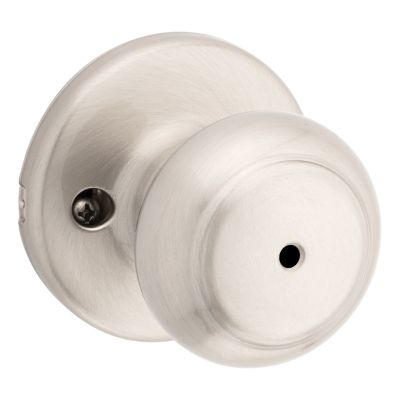 The Kwikset Cove privacy knob in Satin Nickel is designed for interior bed and bath doors that require locking. It features universal handing for right- or left-handed doors, adjustable backset, and Microban antimicrobial protection for a cleaner surface.