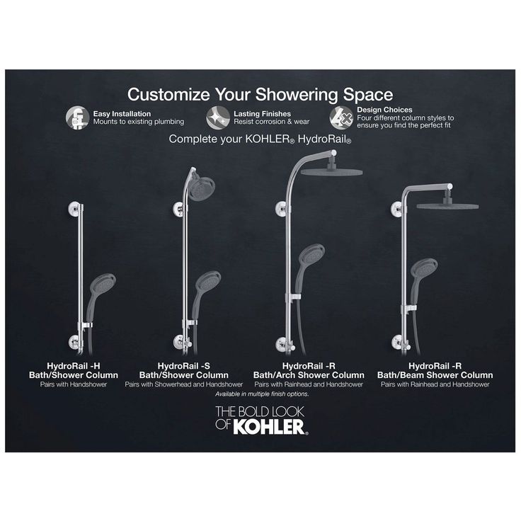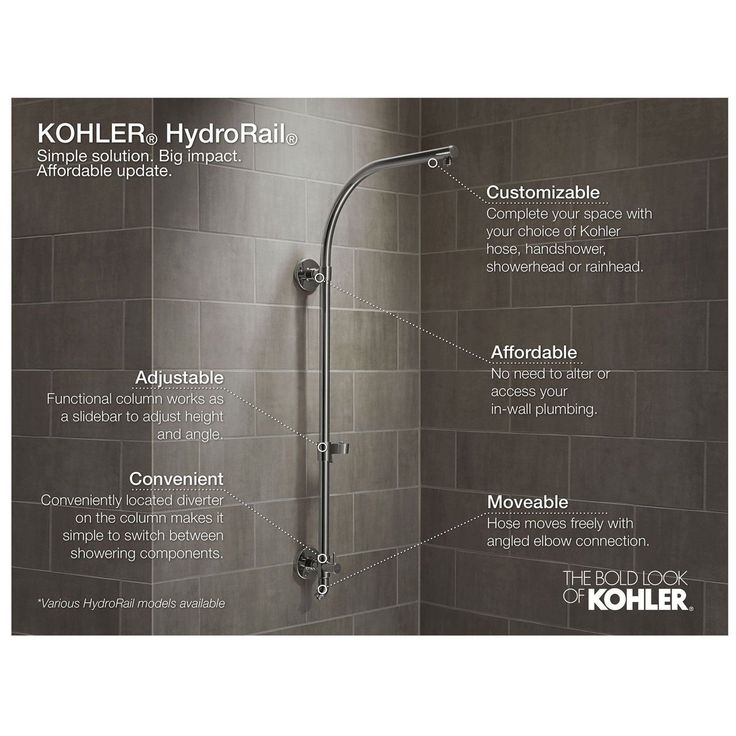 Converts your fixed showerhead to a hand shower and slidebar combination For use in bath and shower installations Patent-pending technology allows for an easy bath/shower installation Slidebar bracket allows you to adjust height and angle of hand shower Includes a column/slide bar and hand shower bracket Includes column/slide bar and hand shower bracket Rainhead, hand shower and shower hose are sold separately to allow for customized decor Developed and optimized for use with KOHLER hand shower and KOHLER Katalyst rainheads 13688, 13689, 13692, and 13695 (sold separately) Includes an adapter that will fit with most installations but may require 1194630, 1187917, or 1194302 and refer to the specification sheet for more information