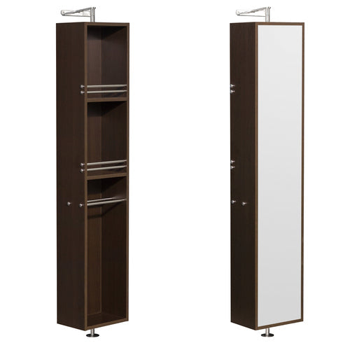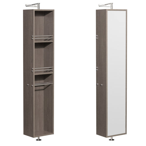 A sleek, rotating wall- and floor-mounted linen cabinet designed to maximize bathroom storage in minimal space. Constructed from high-grade MDF with a melamine laminate exterior, it features a full-length mirror on one side and organized shelving with towel bars on the other.