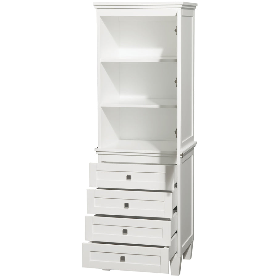 This Acclaim freestanding linen cabinet by Wyndham Collection offers timeless storage in solid oak. At 24 in. wide with a frosted-glass door and four soft-close drawers, it combines durable craftsmanship with a water-resistant, low-VOC finish for everyday bathroom use.