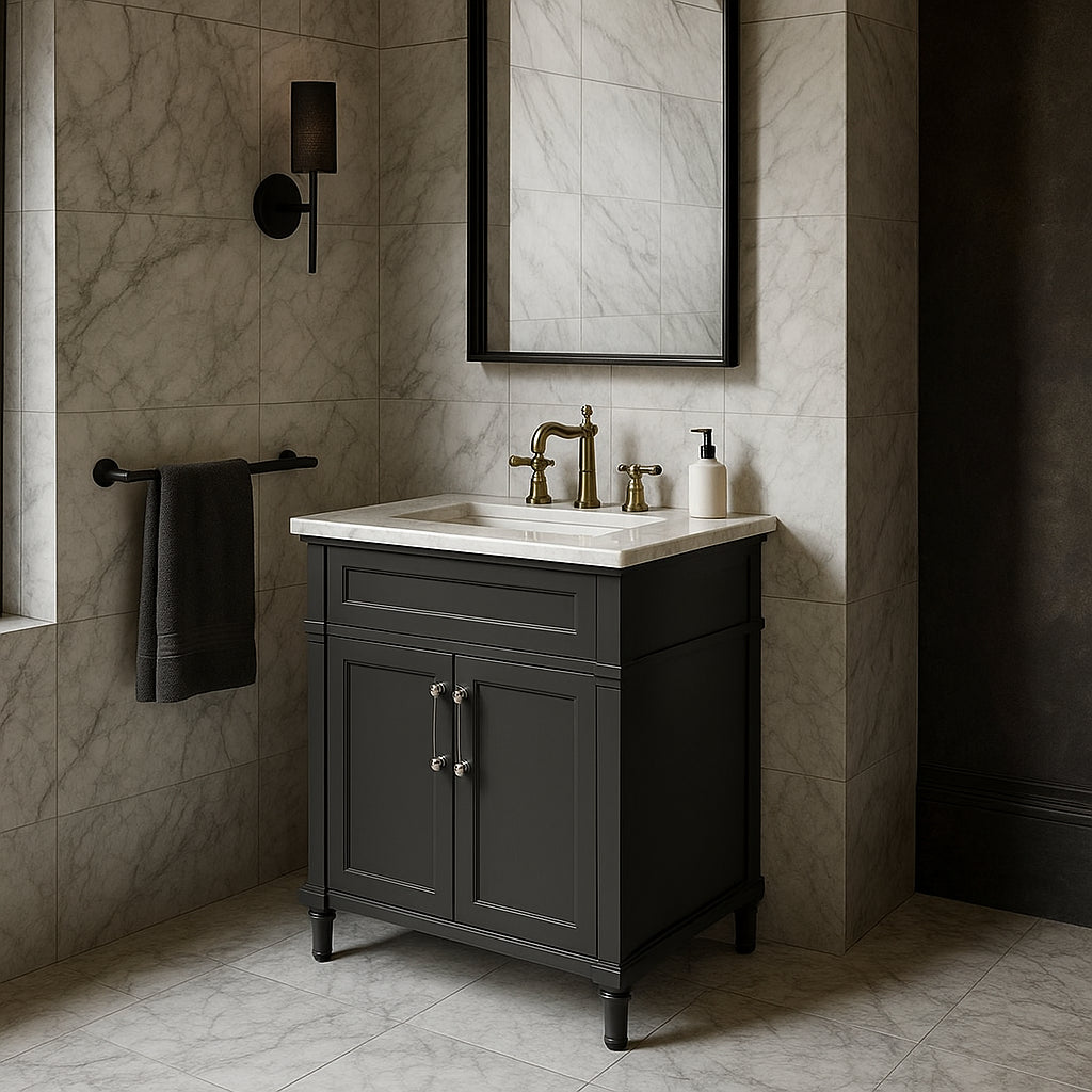 Transform your bathroom into a sanctuary of sophistication with the Aberdeen 30-inch vanity. Its sleek black finish and genuine Carrara marble countertop exude timeless elegance, while the soft-close doors and chrome hardware add a touch of modern luxury. Style it with a pair of wall sconces and a plush rug to create a cozy yet refined space. This vanity is not just a functional piece but a statement of exquisite taste.