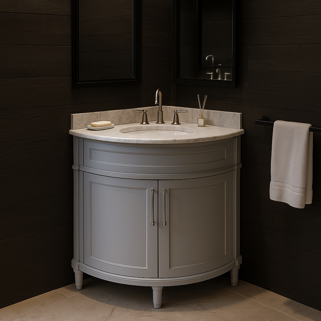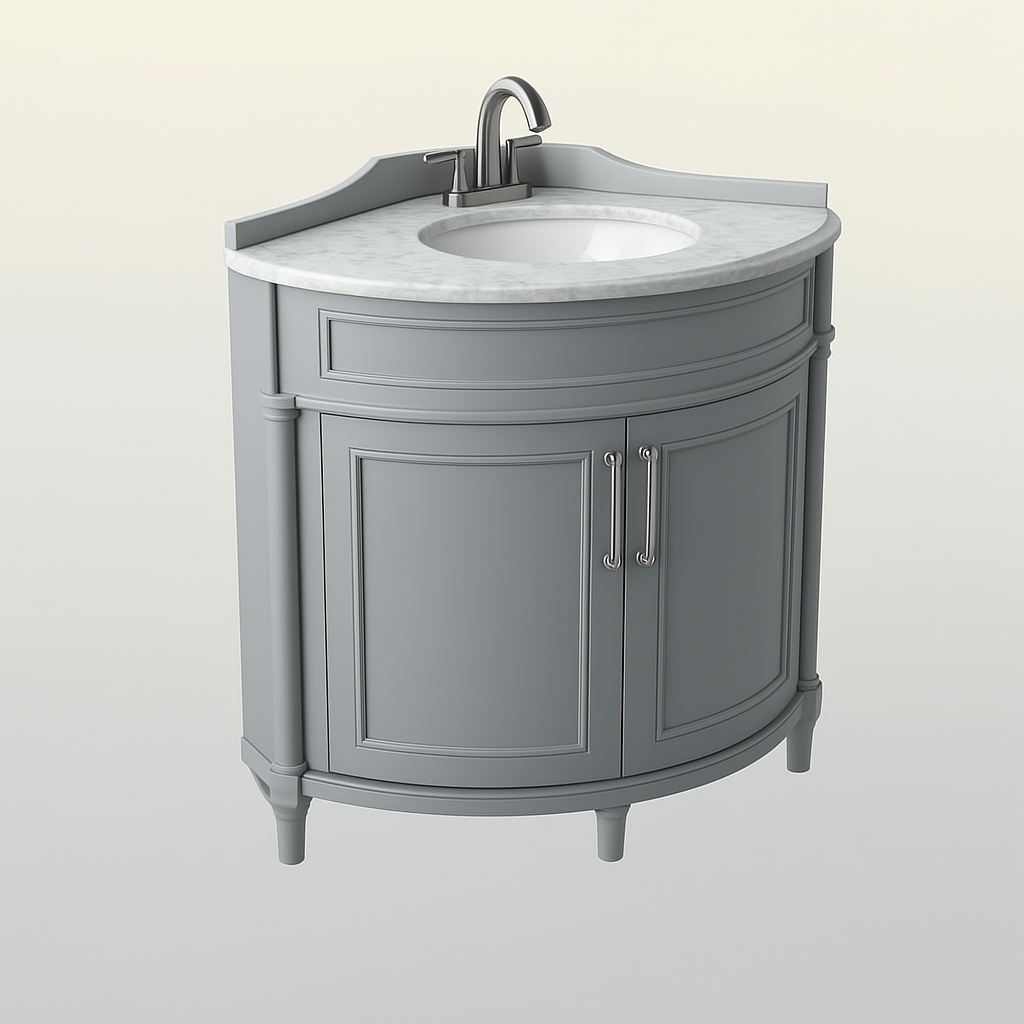 The Aberdeen 32-inch corner vanity combines timeless design with practical functionality. Featuring a dove gray finish, Carrara marble countertop, and soft-close doors, it offers elegance and convenience for your bathroom.