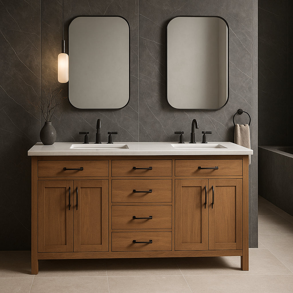 The Bellington Double Sink Vanity combines farmhouse charm with modern functionality. Featuring a durable engineered stone top, ample storage, and antique black hardware, this vanity is perfect for elevating your bathroom decor.
