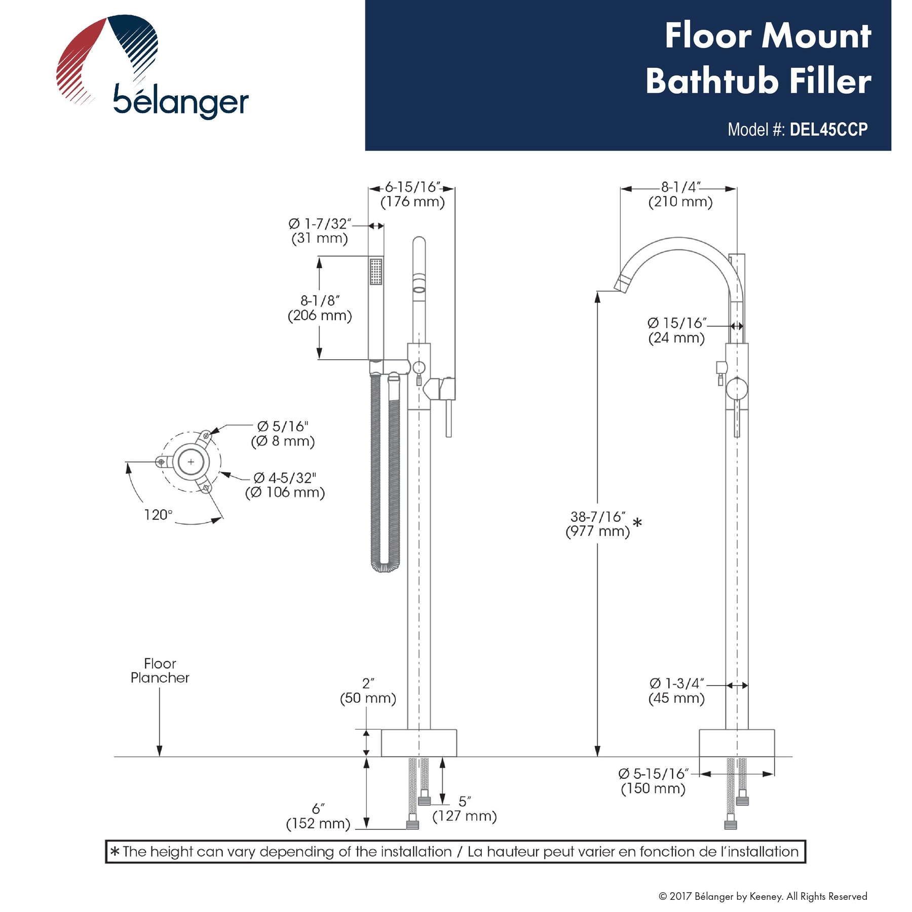 A sleek, floor-mounted bathtub filler from Belanger by Keeney, the Delphi features solid brass construction and a polished chrome finish. Its ceramic disc valve and TempRIGHT temperature limiter deliver smooth, reliable control, while the included hand shower adds versatile rinsing. Designed for easy installation with stainless steel braided connections.