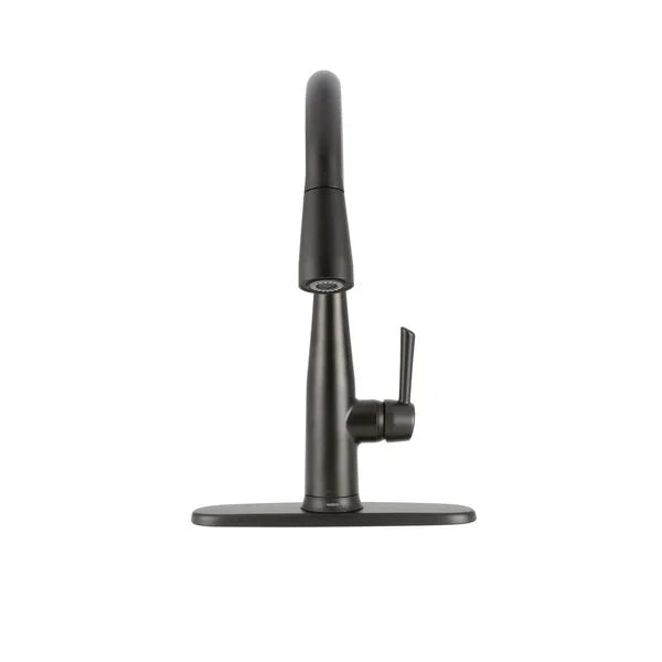A: High-arc gooseneck swivels 360° with a 20-inch retractable hose.