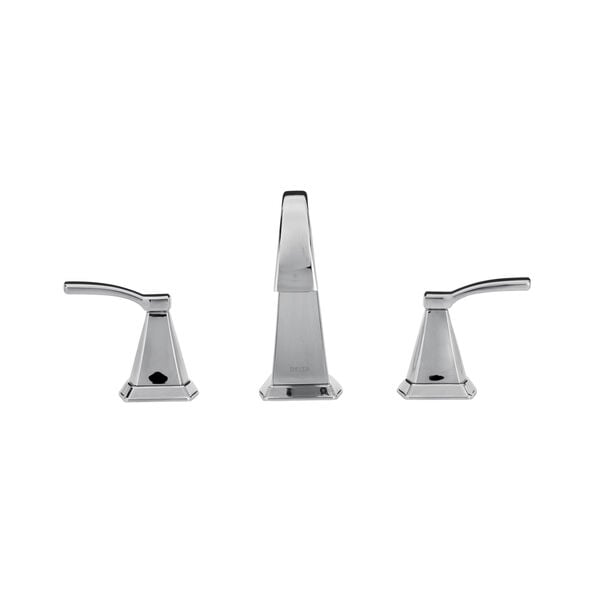 The Delta Flynn 2-handle widespread bathroom faucet delivers a bold, geometric look in a durable Chrome finish. Designed for 3-hole 6–16 in. installations, it includes a matching drain and is WaterSense labeled to save water without sacrificing performance.