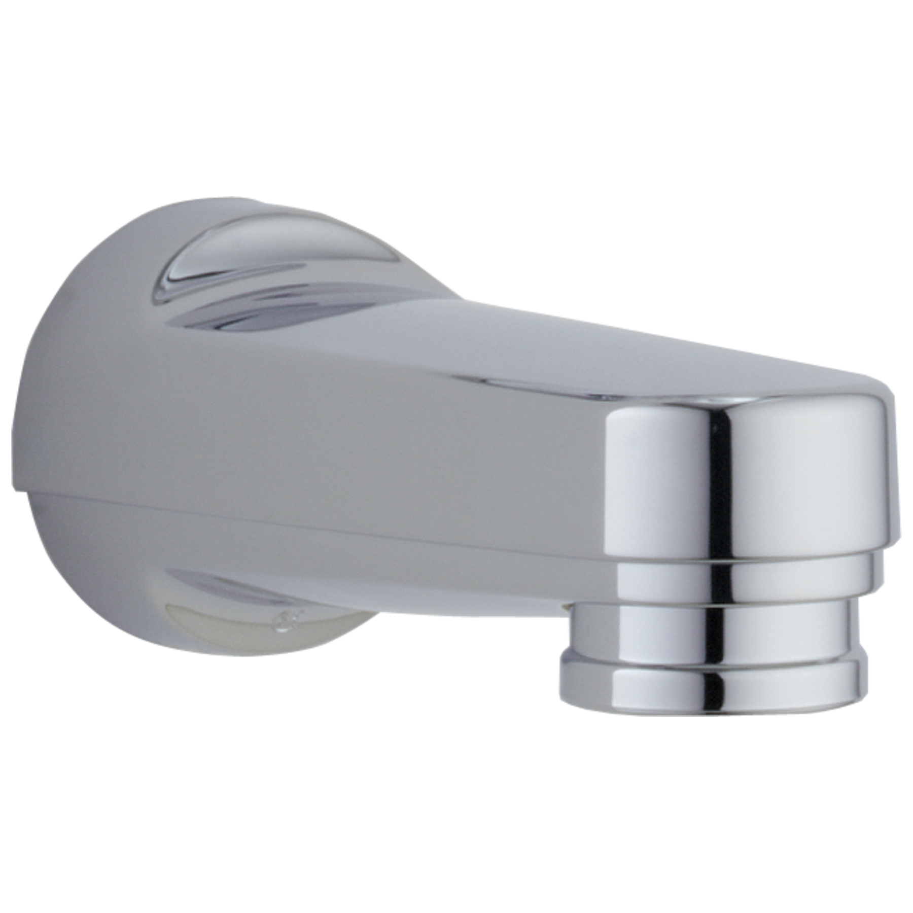 This Delta bathtub spout features a durable metal construction with a polished chrome finish and a pull-down diverter for quick shower activation. Compatible with 1/2-in CWT sweat or 1/2-in IPS threaded connections, it offers reliable performance backed by a limited lifetime warranty.