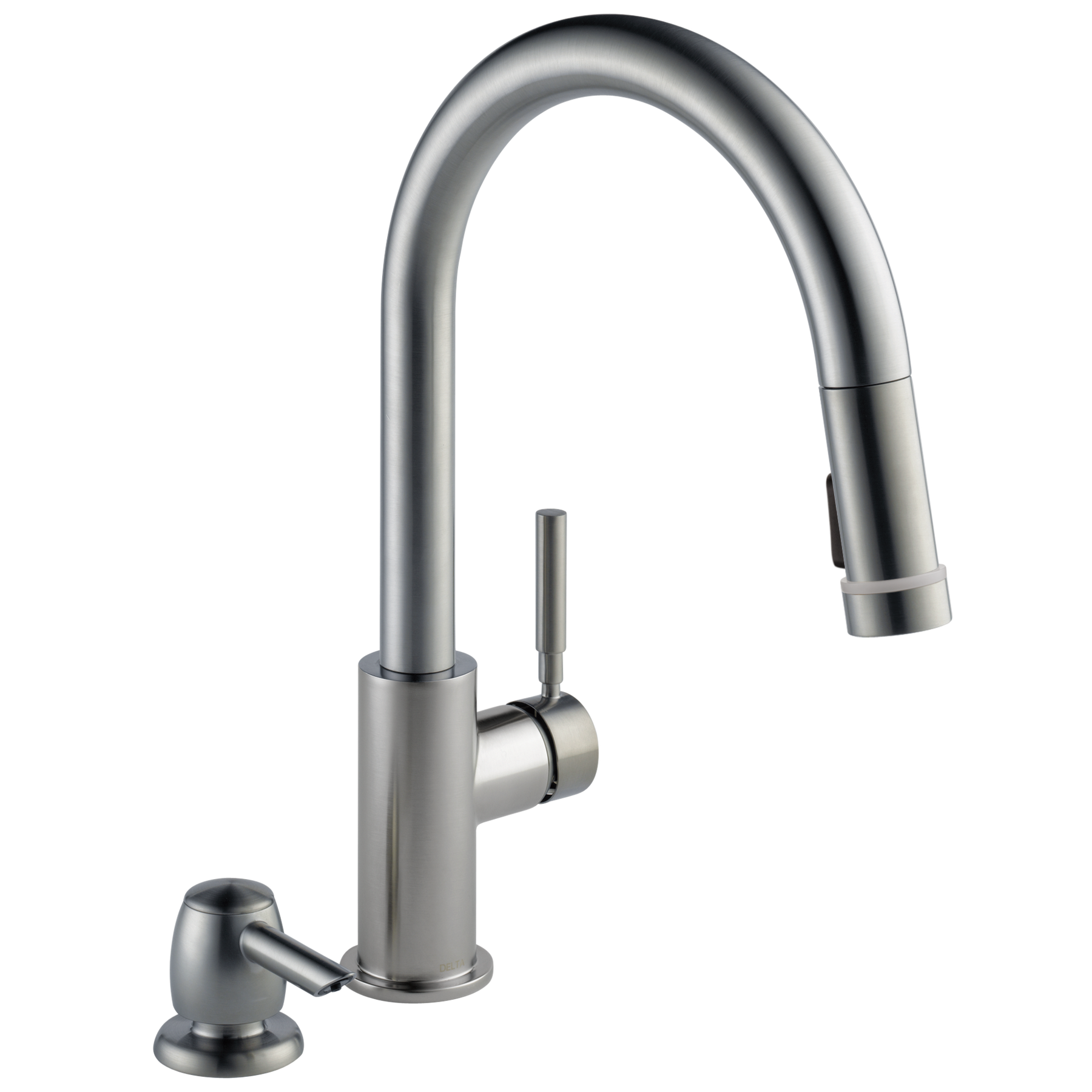 A modern, high-arc pull-down kitchen faucet featuring Delta’s DIAMOND Seal Technology for long-lasting, leak-free performance. SpotShield Stainless finish resists water spots and fingerprints, while MagnaTite magnetic docking keeps the spray wand securely in place. Includes matching soap dispenser and optional deck plate for flexible installations.