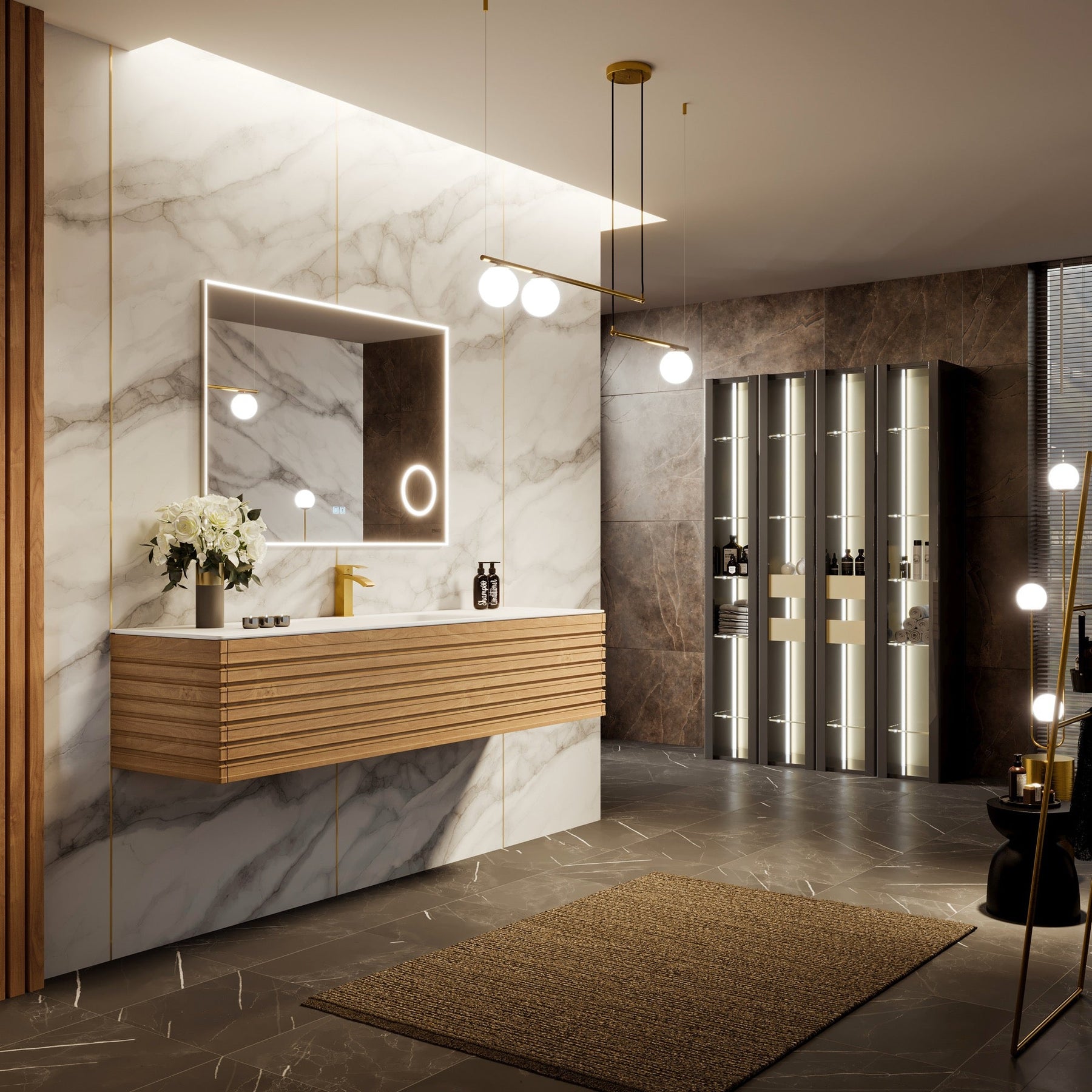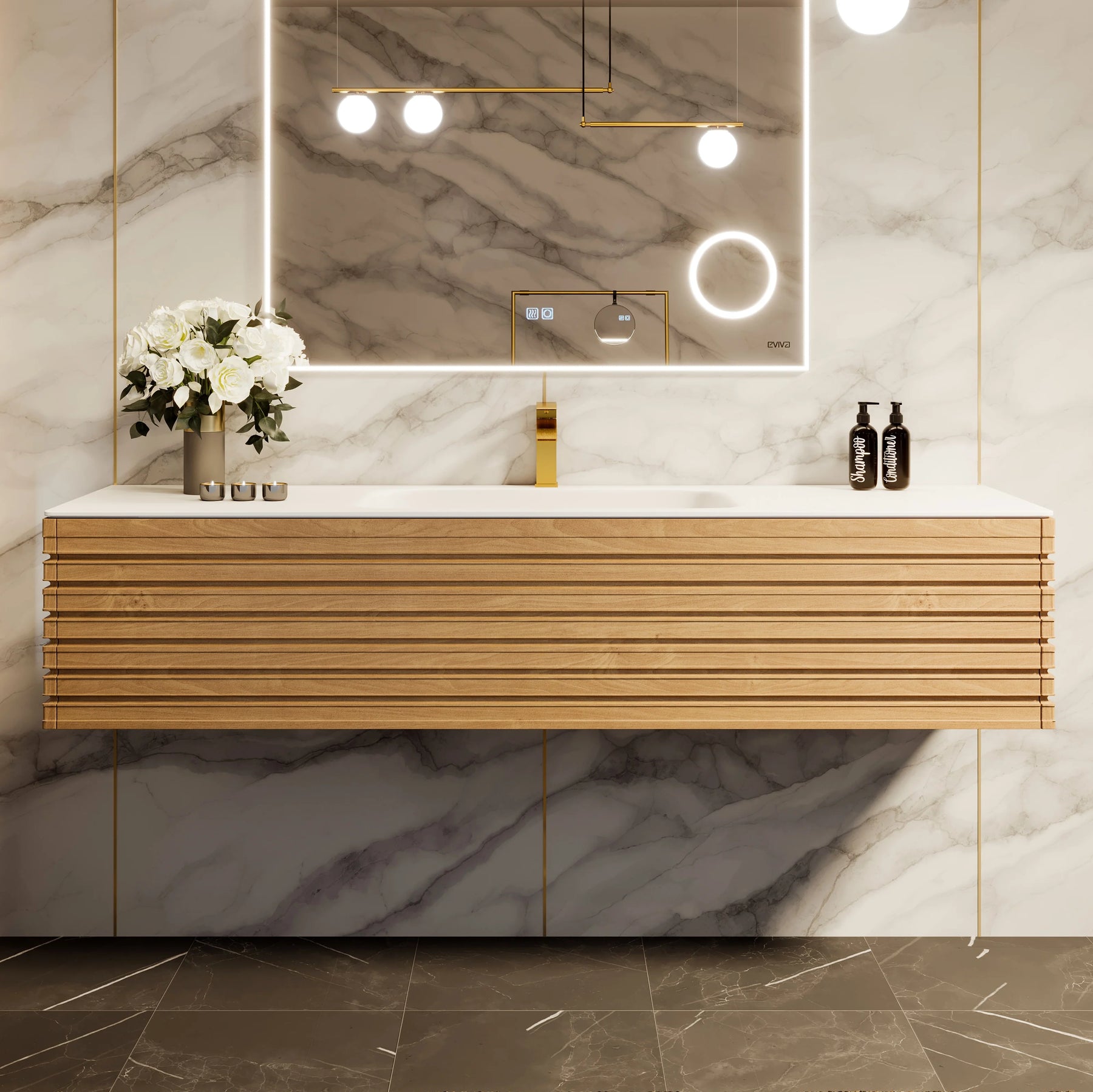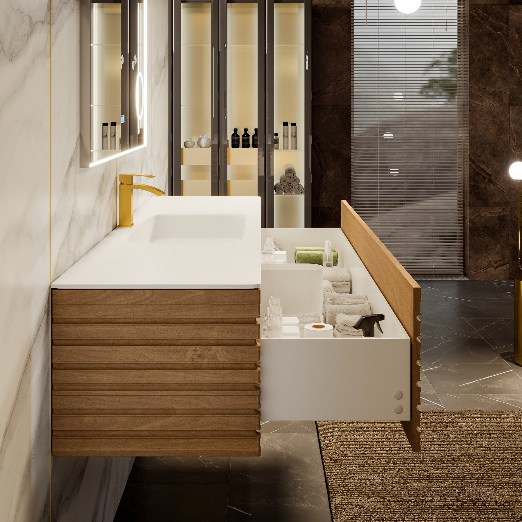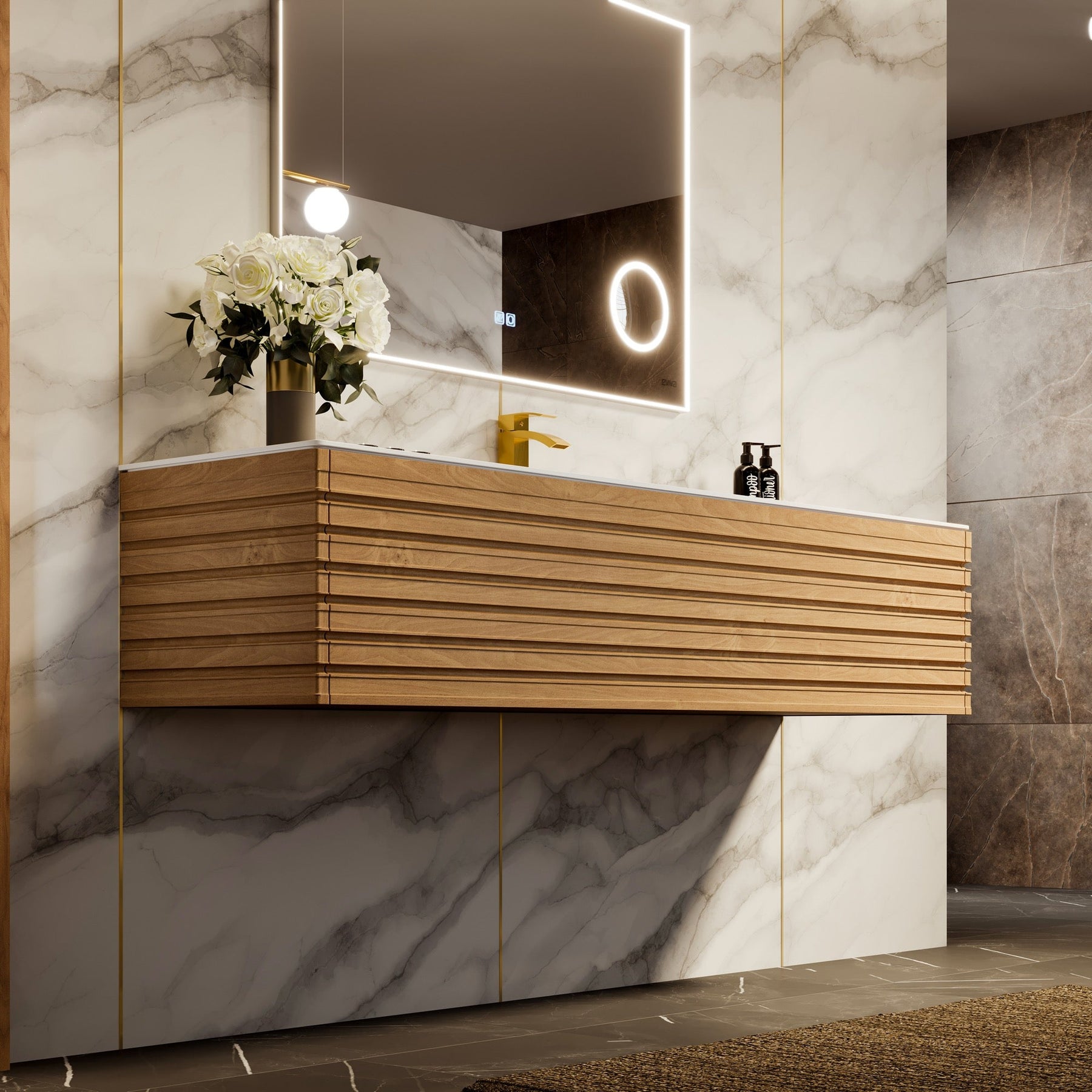 The Allure vanity brings a serene, gallery-like presence to the bath, marrying linear oak textures with a refined, seamless white surface. Its horizontal wood pattern and integrated 45-degree handle create a tailored silhouette that feels both modern and organic. Style it with brushed brass fixtures and soft ambient lighting to amplify its quiet luxury. This piece is an essential touchpoint for a sophisticated, spa-worthy retreat.