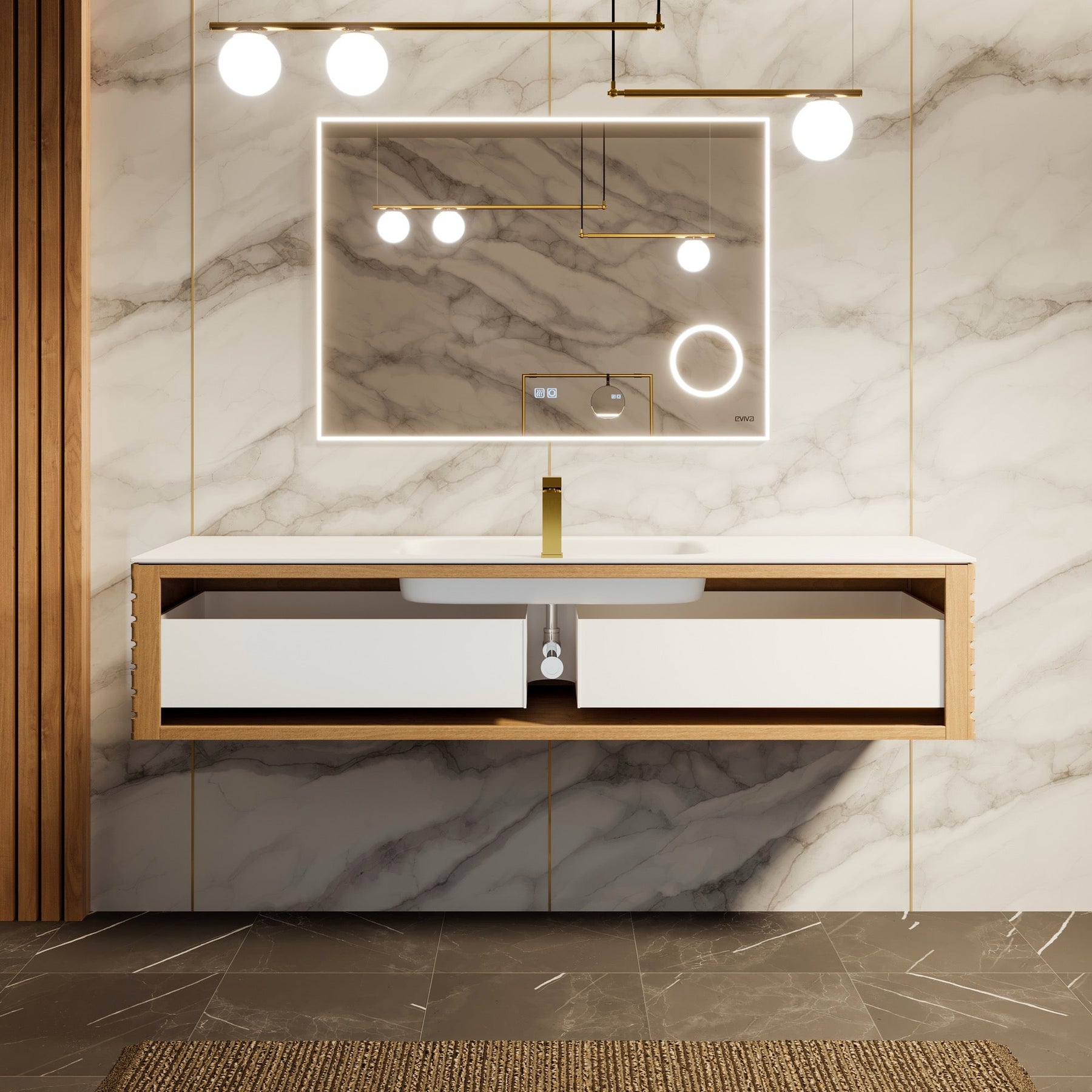 A premium wall-mounted vanity crafted from full solid American oak with a modern white solid surface top and integrated sink. Designed in Spain, it features a stain-resistant, maintenance-free countertop and a soft-closing, fully extending drawer for streamlined storage.