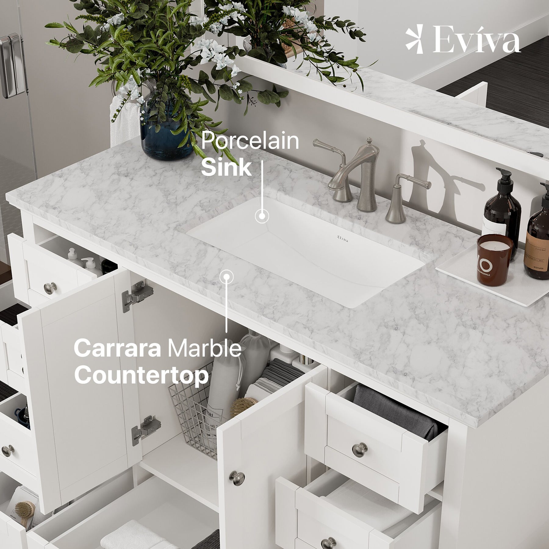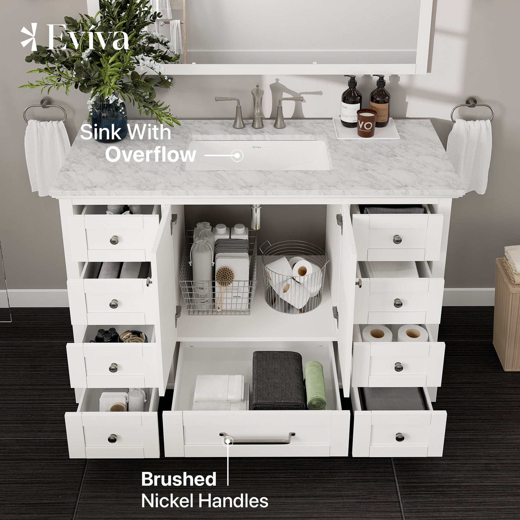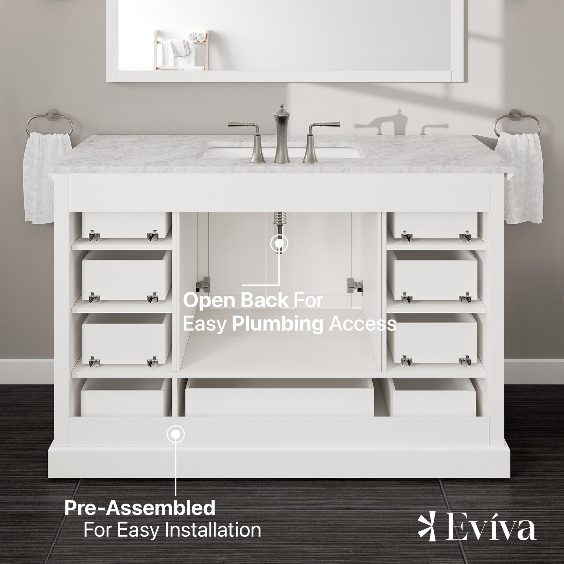 A solid-wood, freestanding vanity in a crisp white finish, the Eviva Frontier pairs a premium White Carrara marble countertop with a durable undermount porcelain sink. Soft-close drawers and doors, brushed nickel hardware, and an open-back design simplify everyday use and installation.