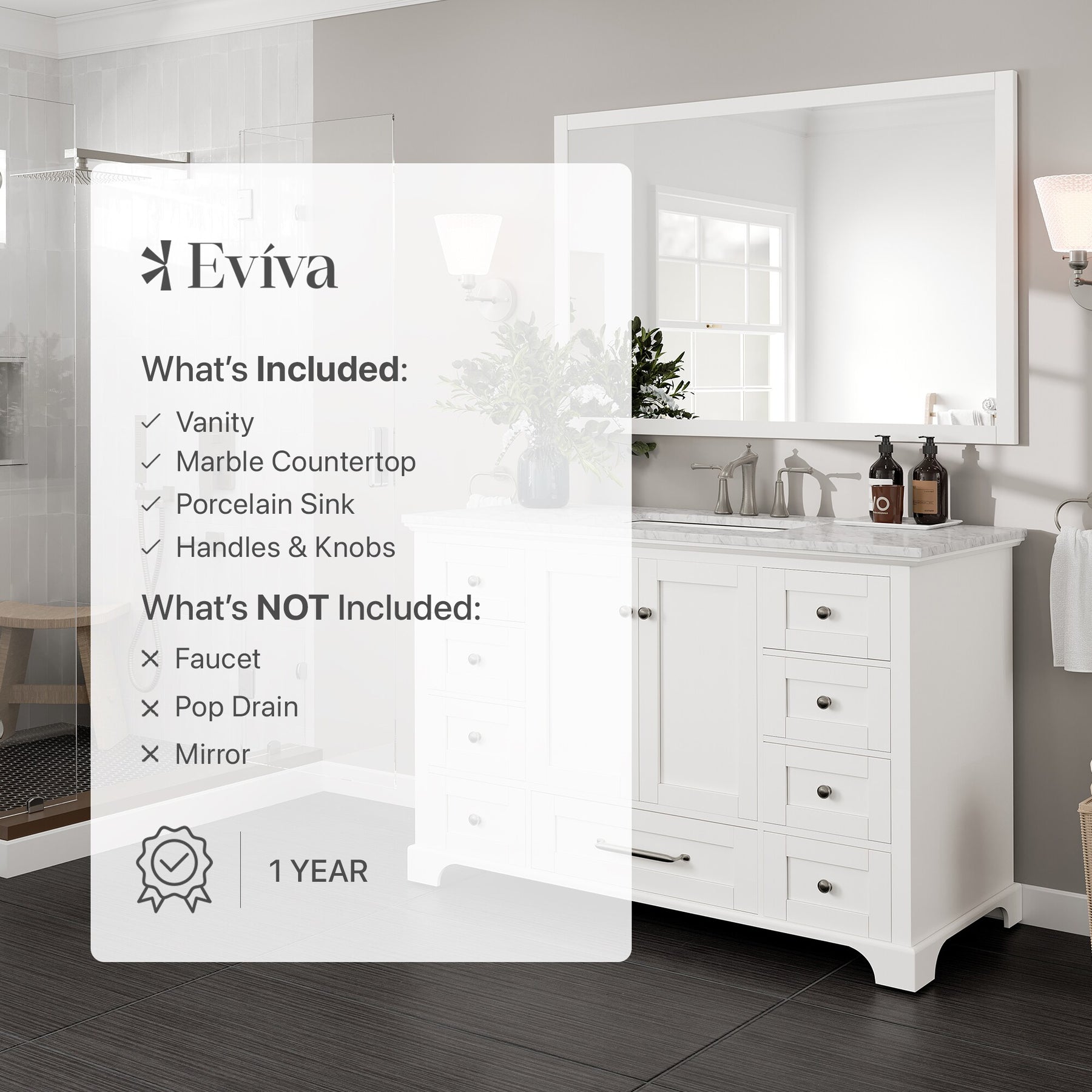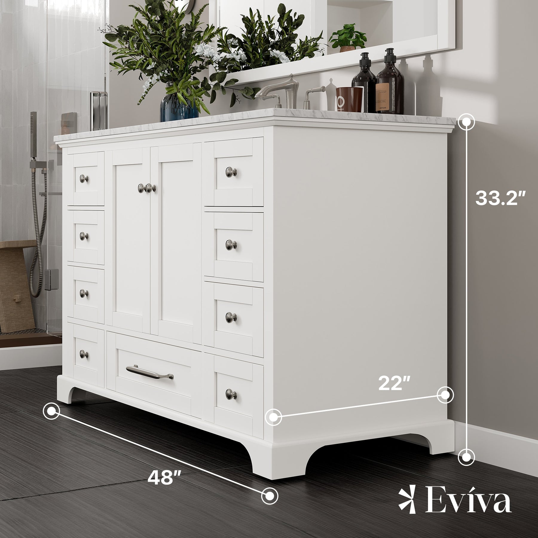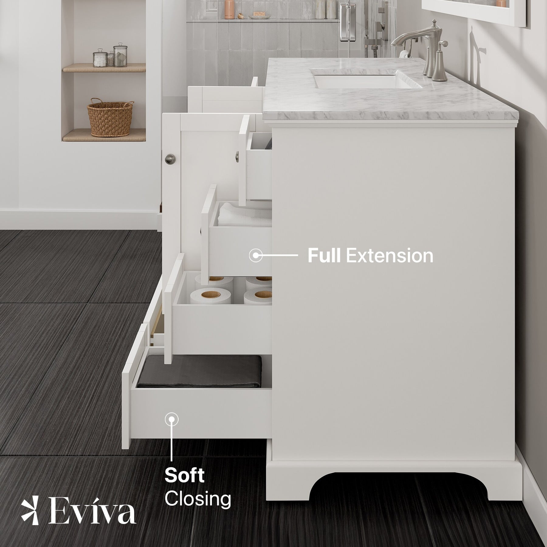 A solid-wood, freestanding vanity in a crisp white finish, the Eviva Frontier pairs a premium White Carrara marble countertop with a durable undermount porcelain sink. Soft-close drawers and doors, brushed nickel hardware, and an open-back design simplify everyday use and installation.