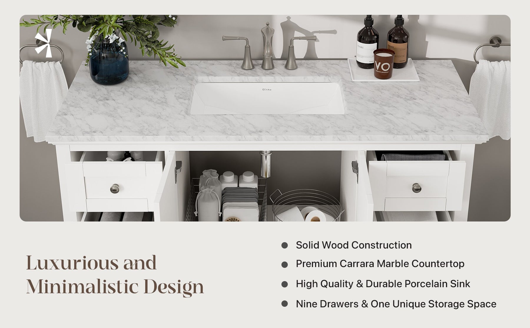 - Premium Marble Top: White Carrara countertop resists stains and is maintenance-free