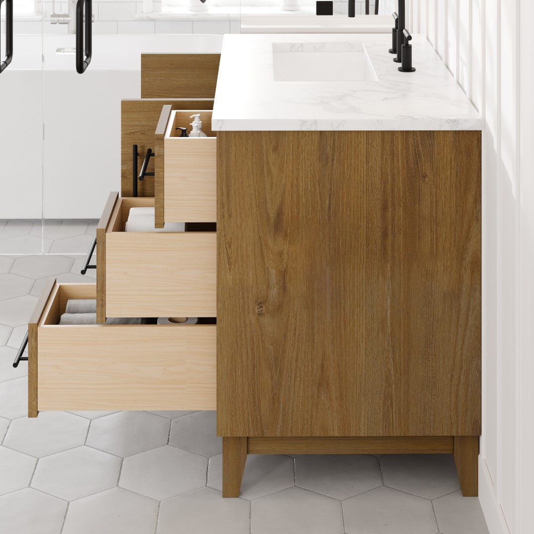Graham’s oak grain brings an organic warmth that instantly elevates a bath into a serene retreat. The veined Arabescato top feels luxurious and effortlessly polished, while the elongated black pulls add a crisp, architectural line. Style it with matte black fixtures and linen textures to echo its modern‑transitional spirit. This vanity is the quiet hero of a refined, livable bath.