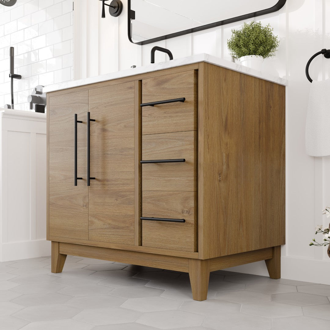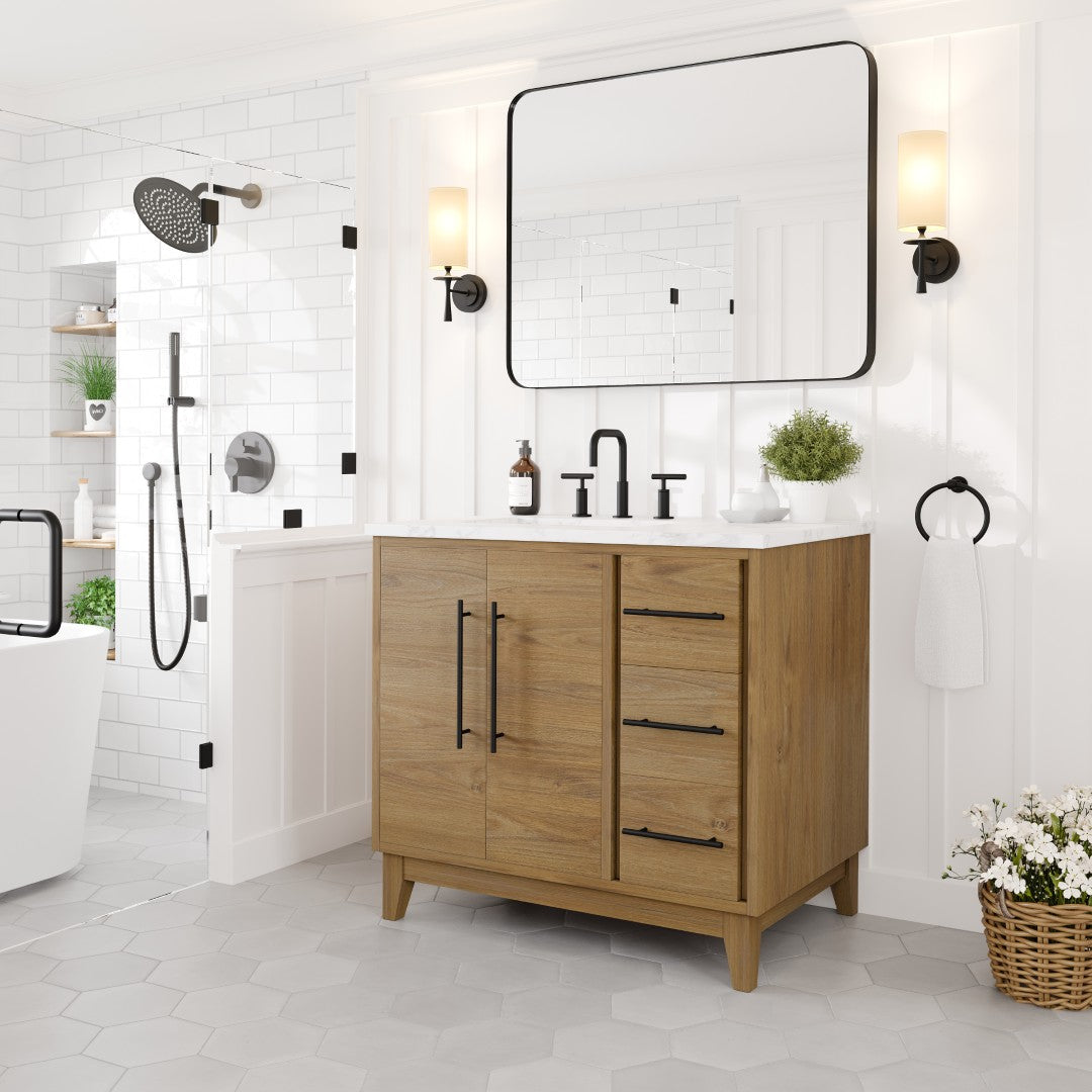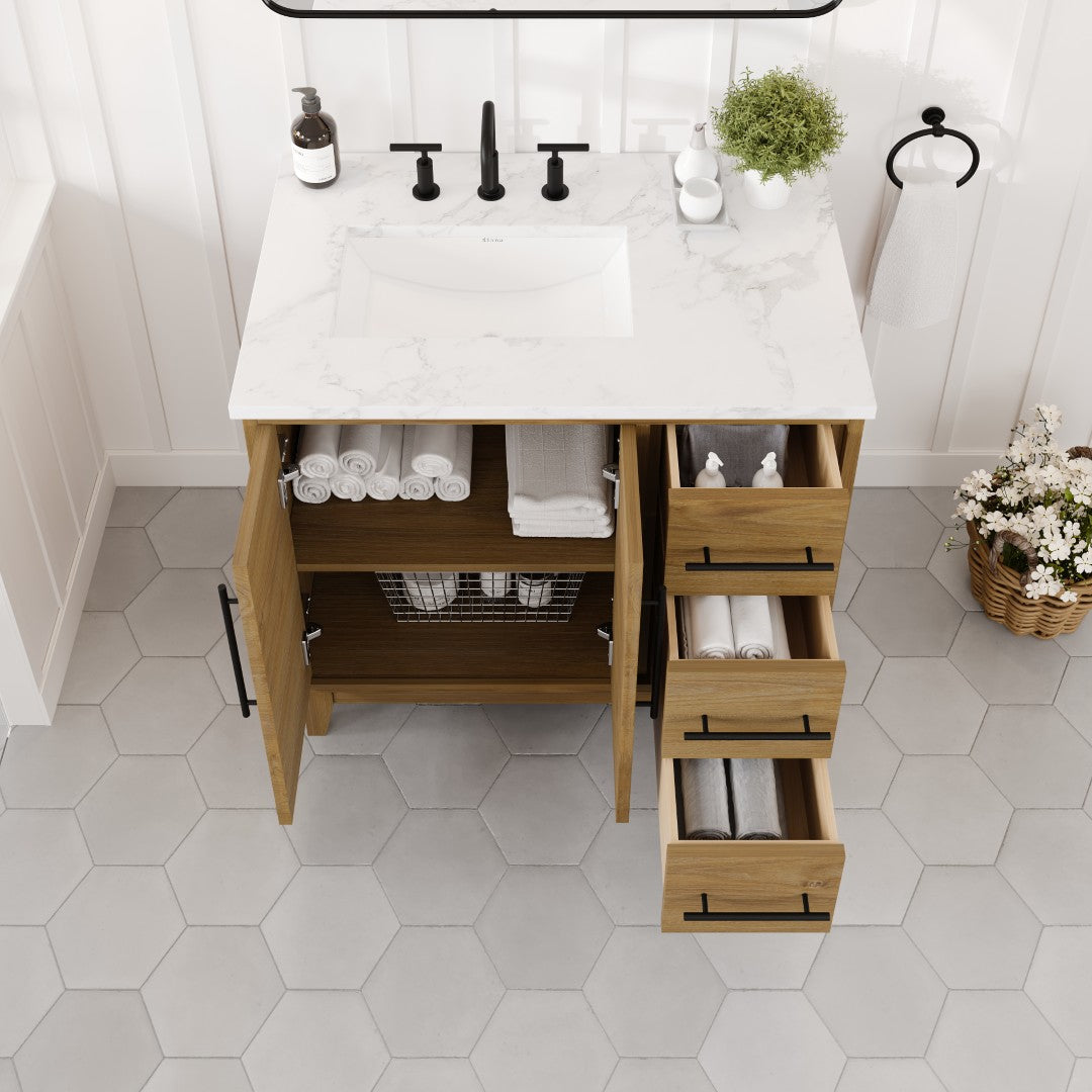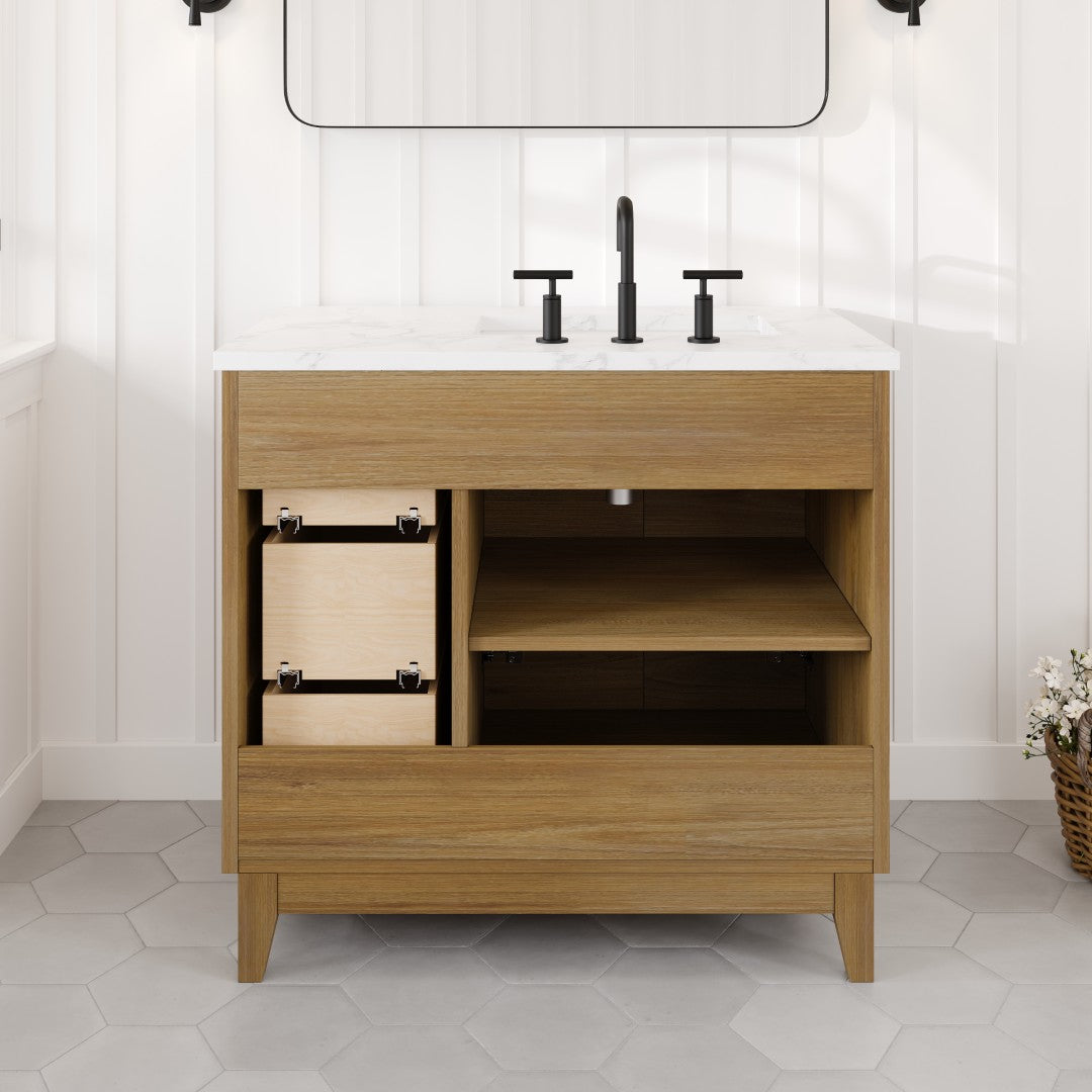 Eviva Graham 36"W x 22"D Oak Bathroom Vanity with White Arabescato Engineered Stone Countertop and Undermount Ceramic Sink