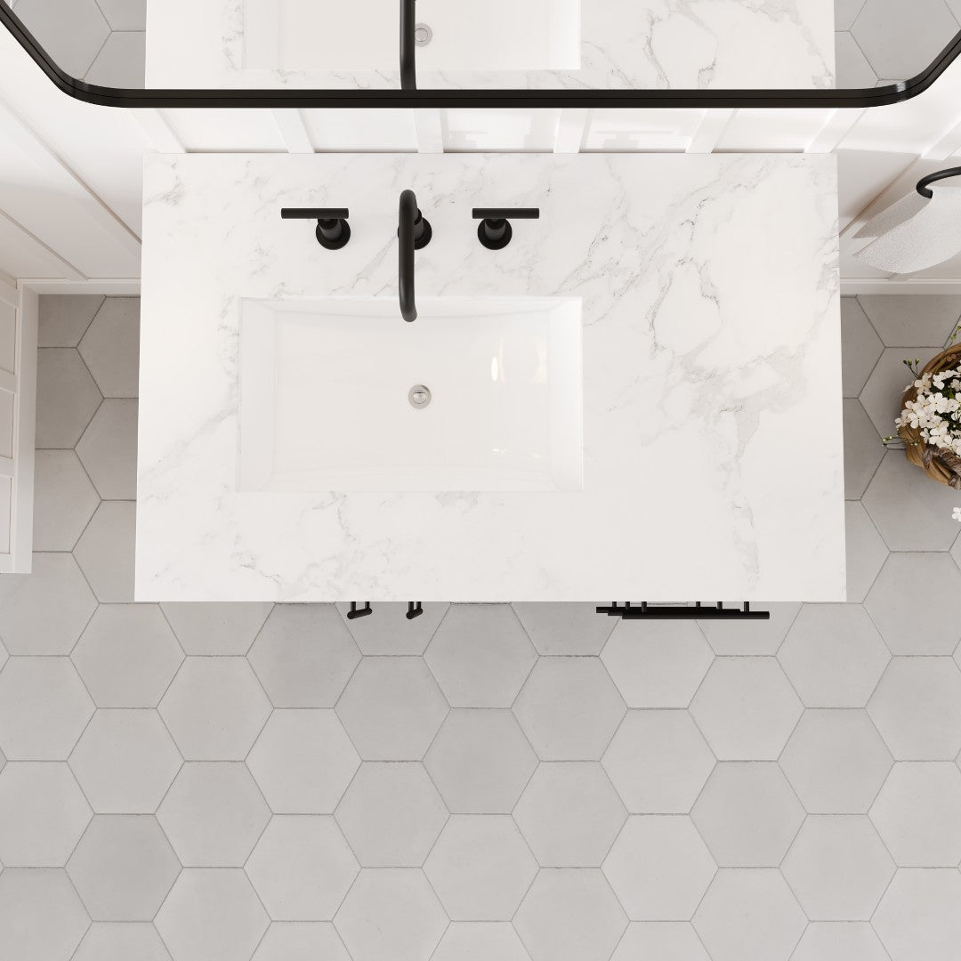 • Premium Countertop: White Arabescato engineered stone is stain-resistant and low maintenance