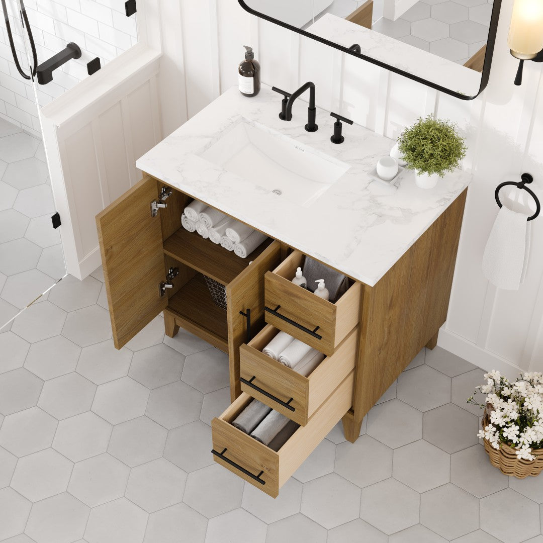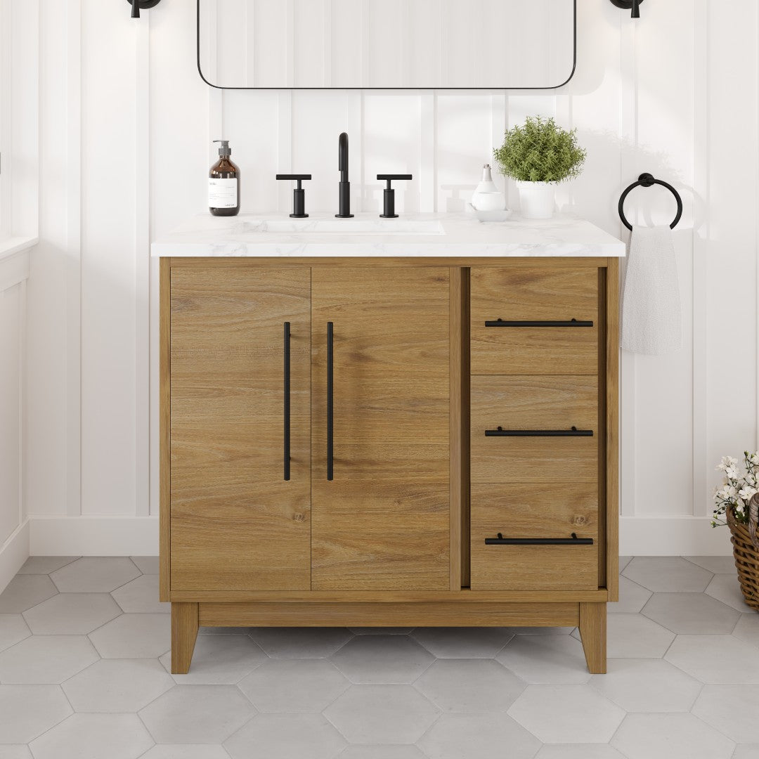 A transitional 36-inch freestanding vanity in a textured Oak finish, crafted from solid and engineered wood. It features a stain-resistant White Arabescato engineered stone countertop with an undermount porcelain sink, soft-closing doors and drawers, and black stainless steel hardware for a refined, durable upgrade.