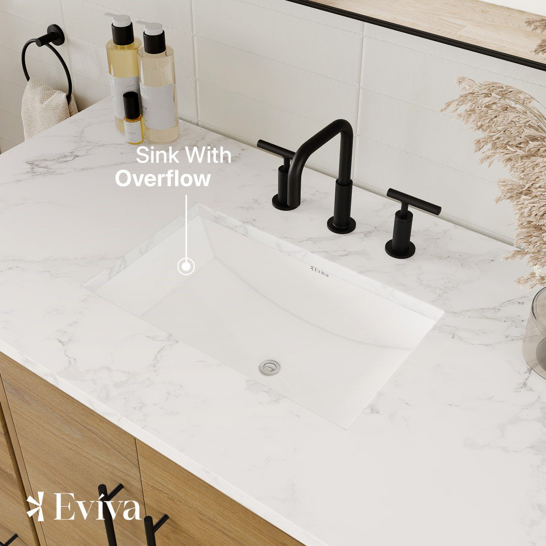 The Eviva Graham 48-inch freestanding vanity blends a textured oak finish with a white Arabescato engineered stone countertop for timeless style and durability. Built from high-grade engineered wood with solid wood legs, it features an undermount ceramic sink and pre-drilled 8-inch widespread faucet holes for easy setup. Soft-closing doors and full-extension drawers provide generous, organized storage.