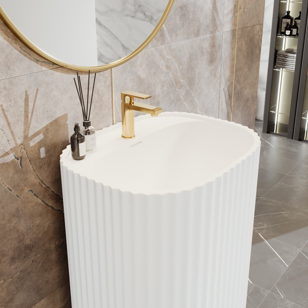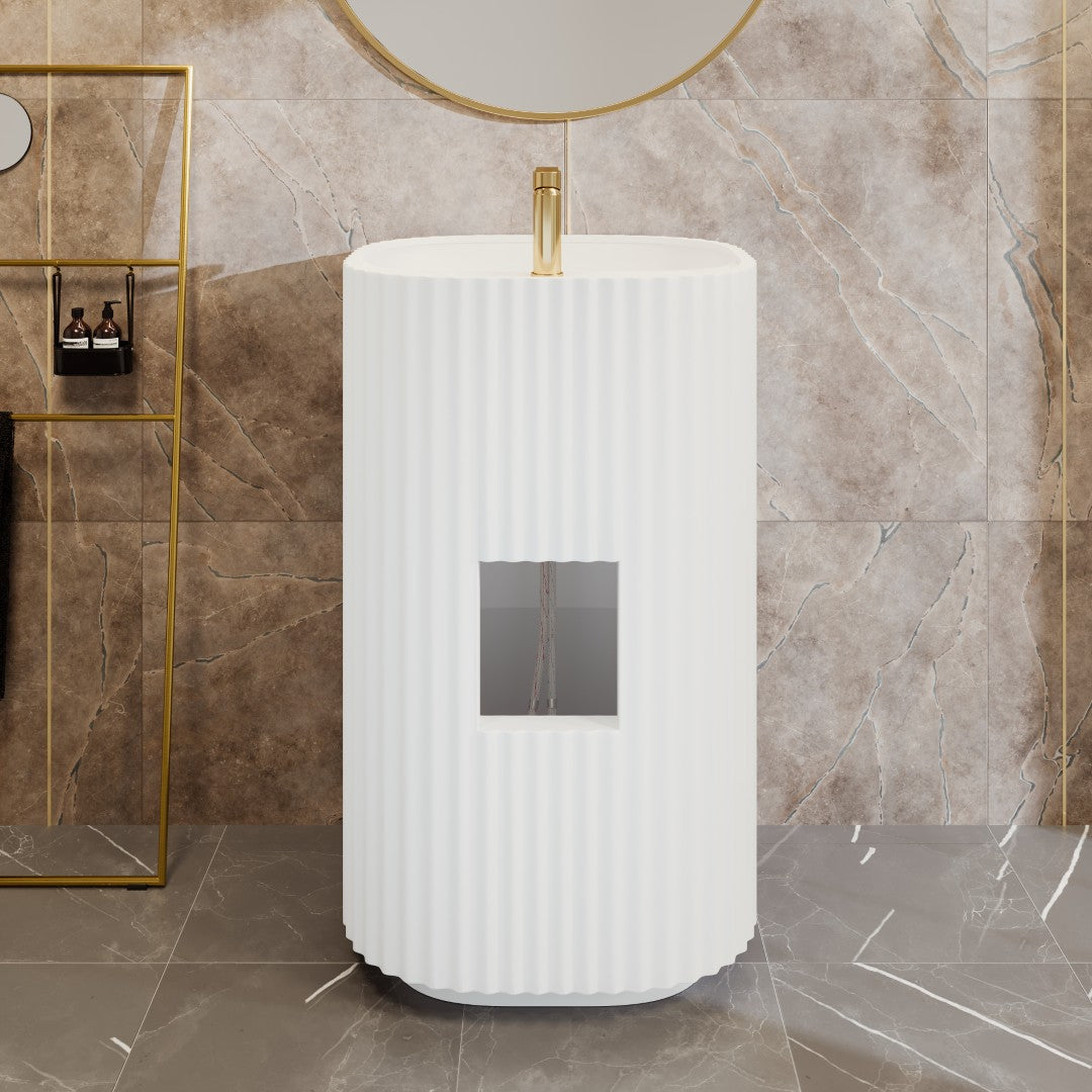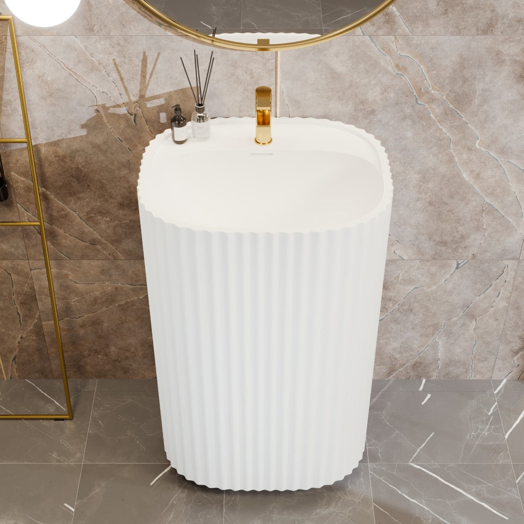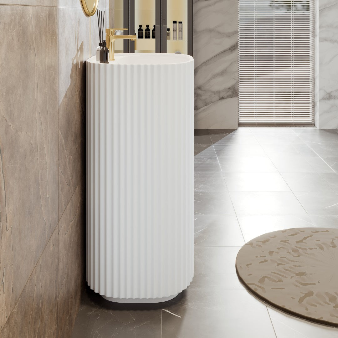 Sculptural ribbed pedestal sink crafted from durable, non-porous solid surface for modern bathrooms. The 20 in. W x 16 in. D compact footprint with an integrated basin delivers a seamless look and easy maintenance, while the flared base enhances stability.