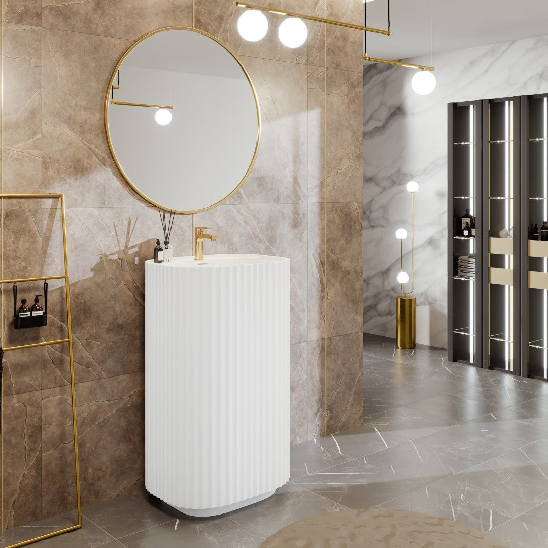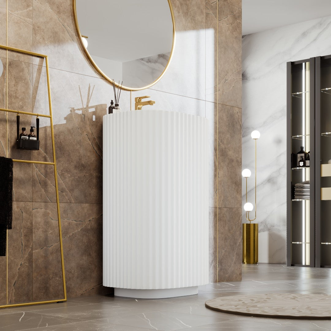 The Haven pedestal reads like a modern column—its fluted silhouette adds rhythmic texture and quiet drama. I love the integrated basin that melts into the solid surface, creating a continuous, gallery-worthy profile. Pair it with a warm brass faucet and a round mirror to echo its soft curves. It’s a refined essential that elevates everyday rituals into a luxurious experience.