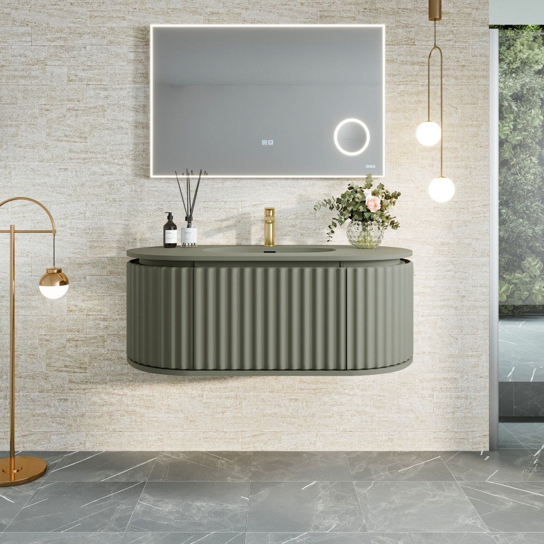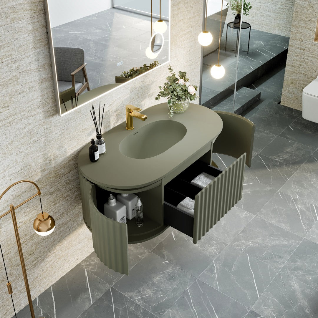 The Haven vanity drapes your bath in a velvety wash of olive green, its fluted façade creating a rhythm of light and shadow. The integrated solid-surface top forms a seamless silhouette that feels bespoke and exquisitely tailored. Float it against textured stone or limewash walls and pair with warm brass for a quietly opulent moment. It’s a statement of refined luxury—functional art for everyday ritual.
