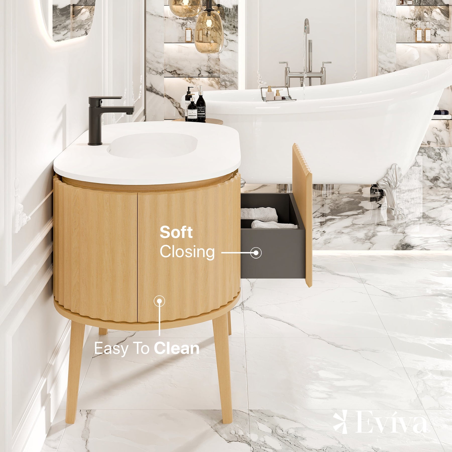 The Haven vanity is a study in graceful curvature—its fluted oak facade and tapered legs bring a tailored warmth to any bath. The seamless white solid surface top feels quietly luxurious, cradling an integrated basin that keeps the look pristine. Style it with a matte black single‑hole faucet and luminous globe pendants to echo its rounded silhouette. It’s an effortless statement piece that anchors a spa-worthy, modern sanctuary.