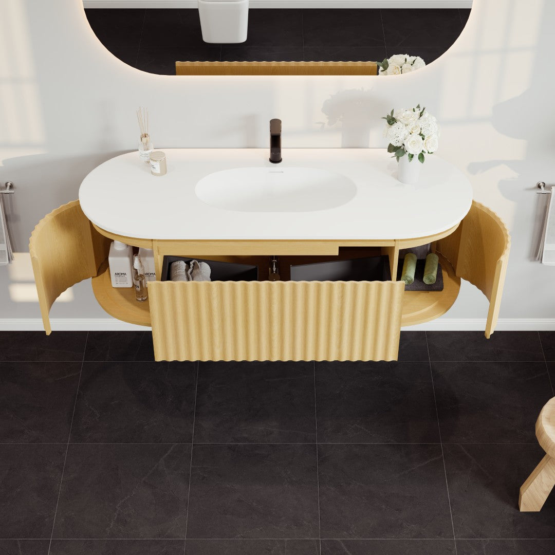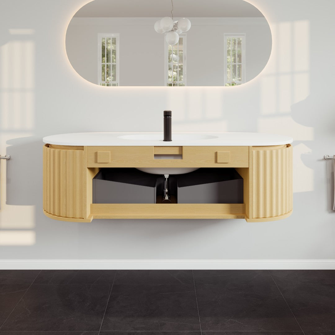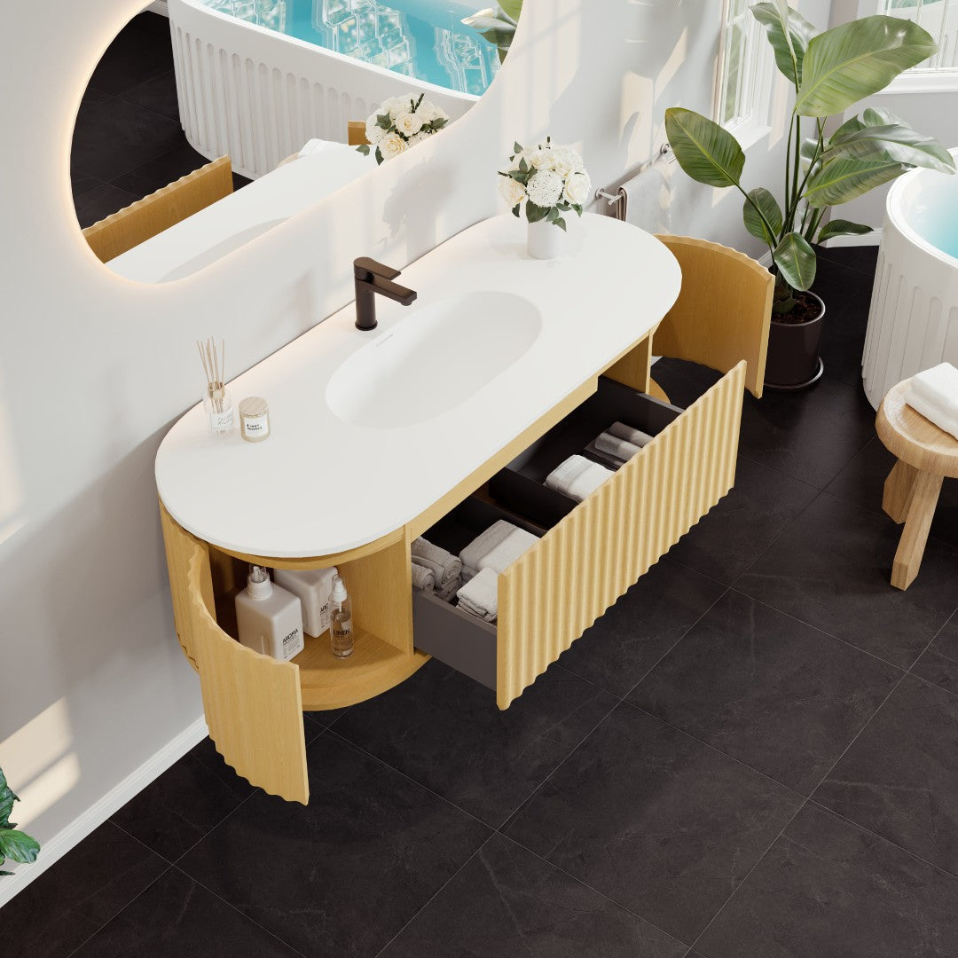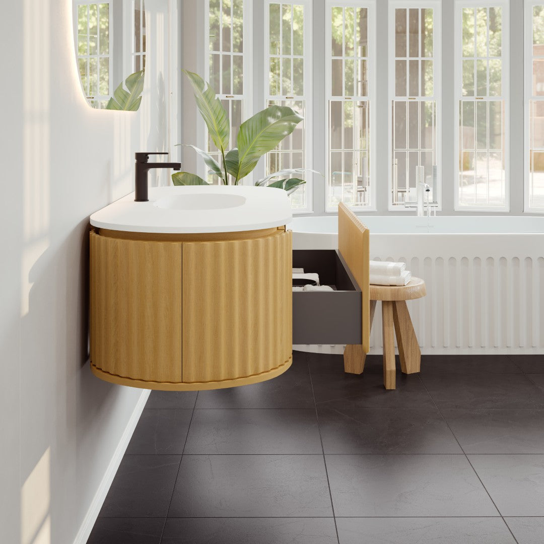 The Haven vanity drapes the room in quiet luxury—its fluted oak facade and softened corners create a gentle rhythm that feels bespoke. I love how the seamless solid surface top melts into the integrated basin, a crisp counterpoint to the warm wood. Style it with matte black fixtures and a softly backlit mirror to accentuate the floating silhouette. It’s a refined essential that elevates daily rituals into moments of indulgence.