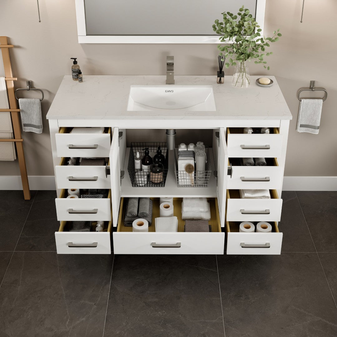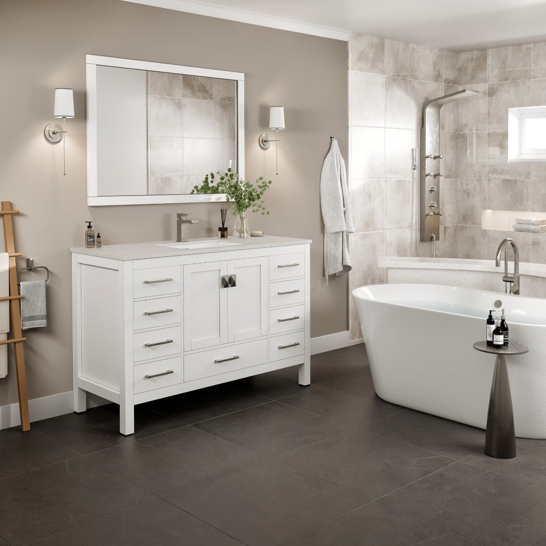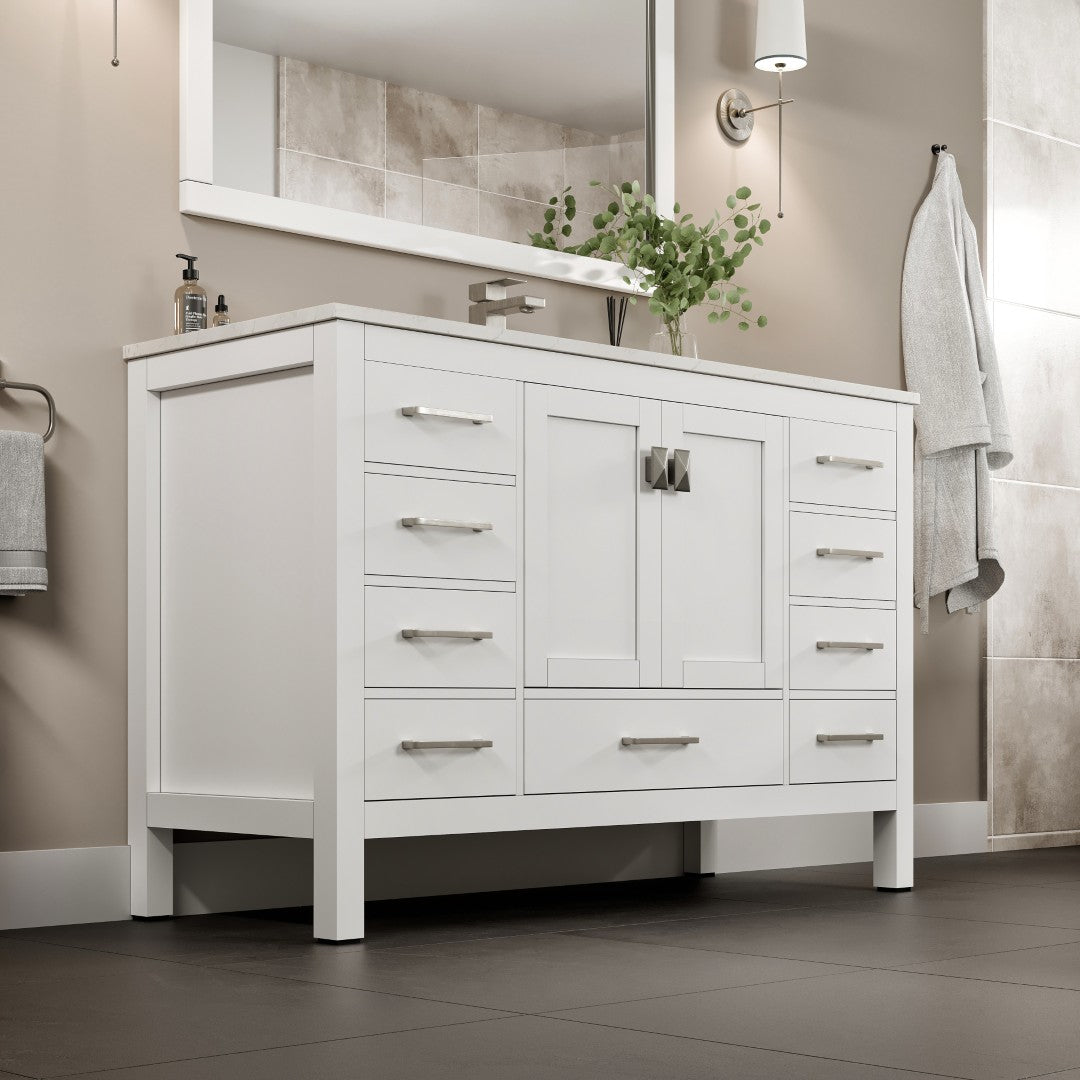 A 54-inch freestanding vanity built from solid wood with a stain-resistant White Carrara Quartz countertop and an undermount porcelain sink. Its 18-inch depth and abundant soft-closing storage make it ideal for maximizing space in transitional bathrooms.