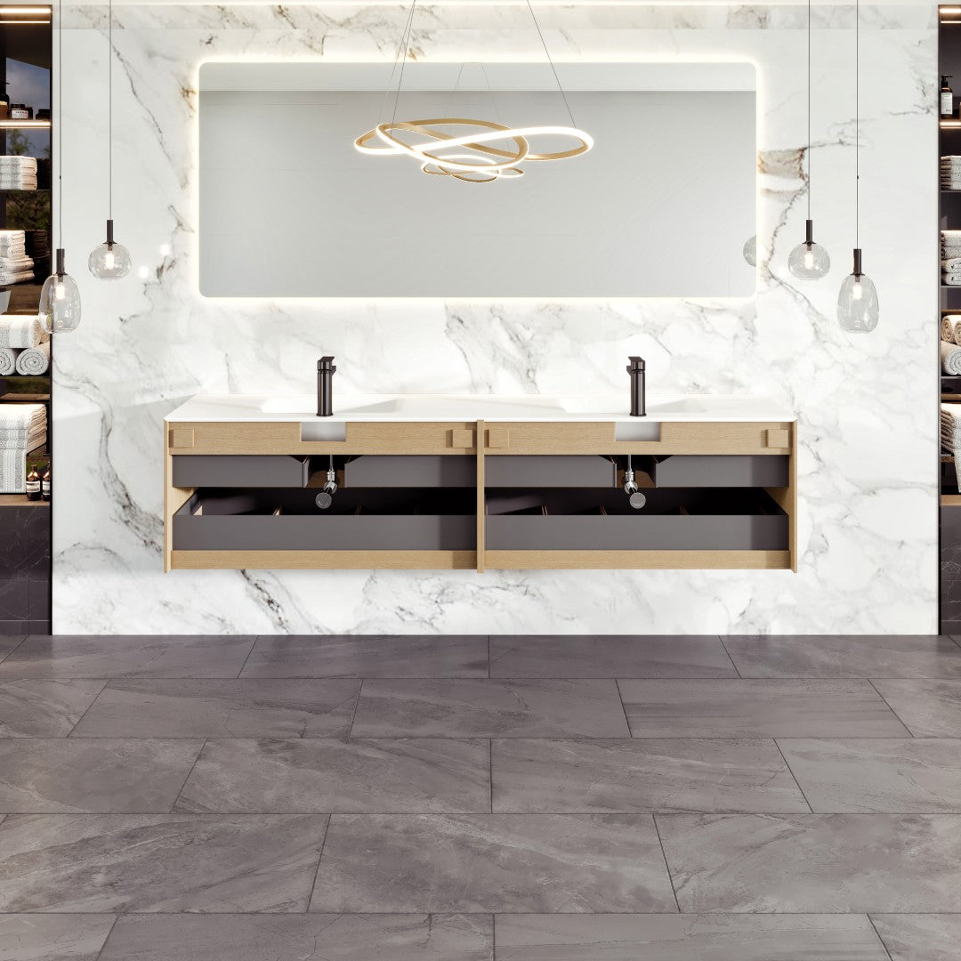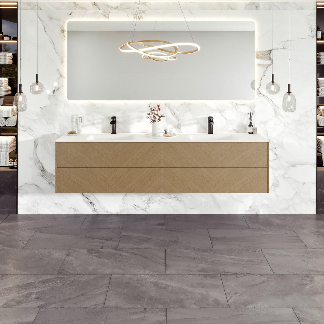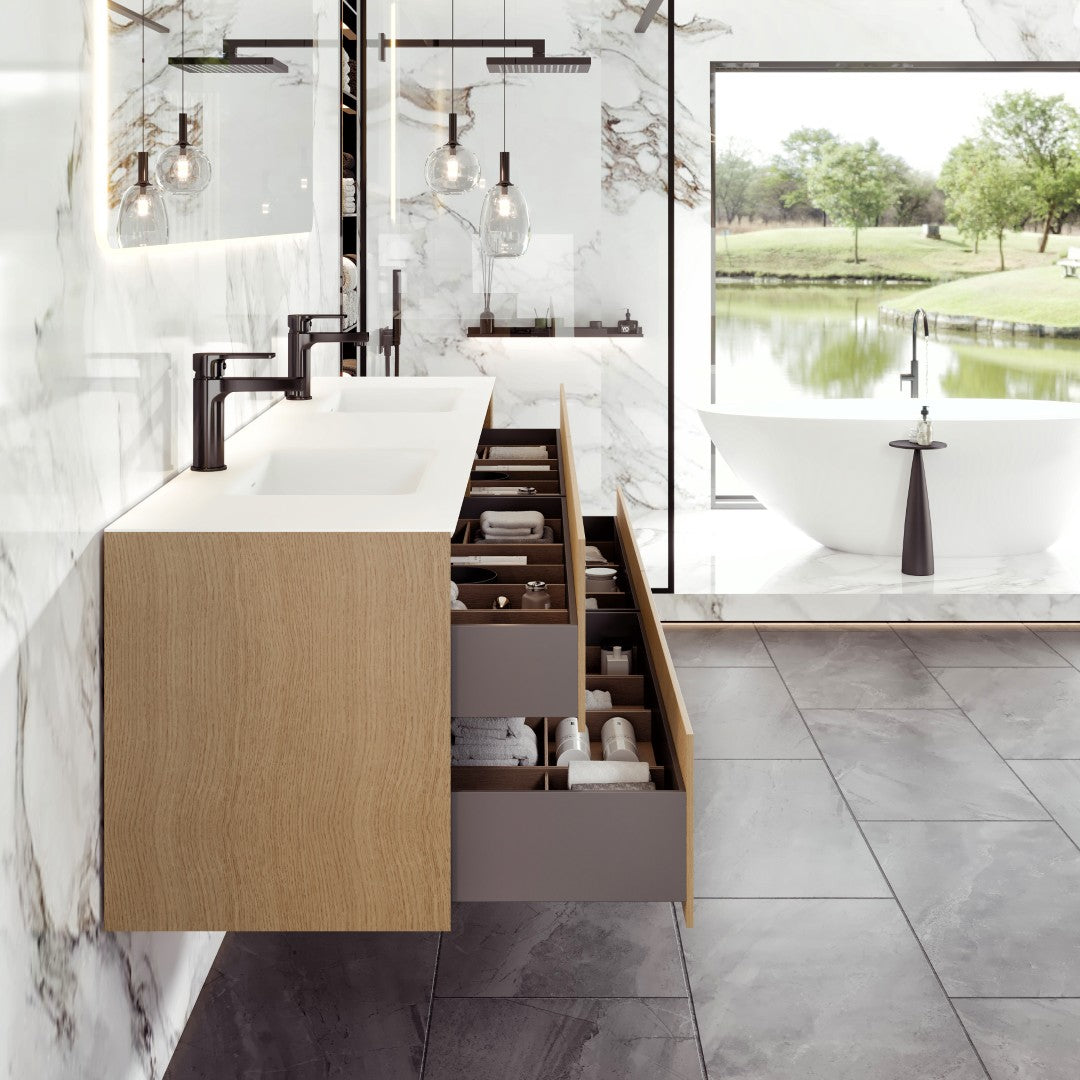 This floating vanity brings a calm, refined presence to the bath, with oak’s gentle grain playing against the luminous white top. The integrated sinks and handle-free drawers create a seamless silhouette—quiet luxury at its best. Style it with matte black fixtures and warm lighting to accentuate its modern lines. A sophisticated essential that elevates everyday rituals into moments of elegance.