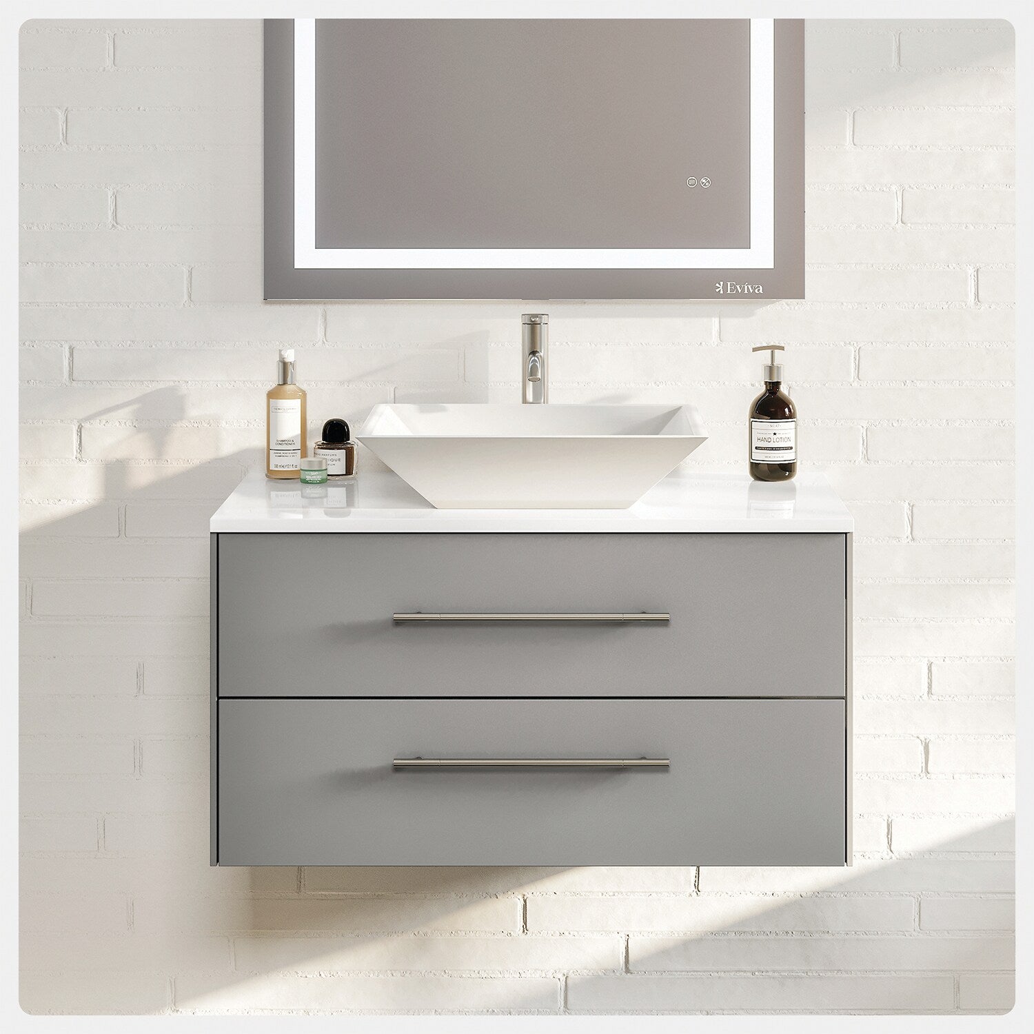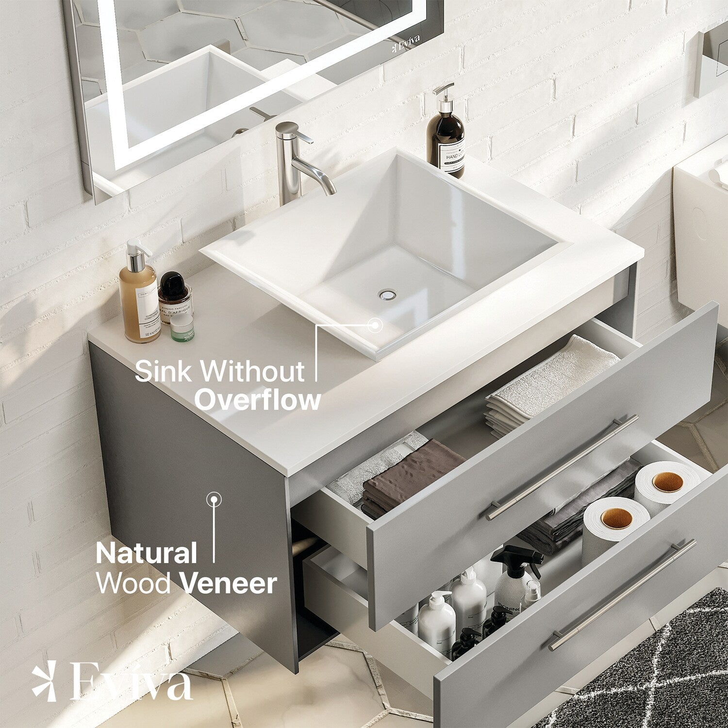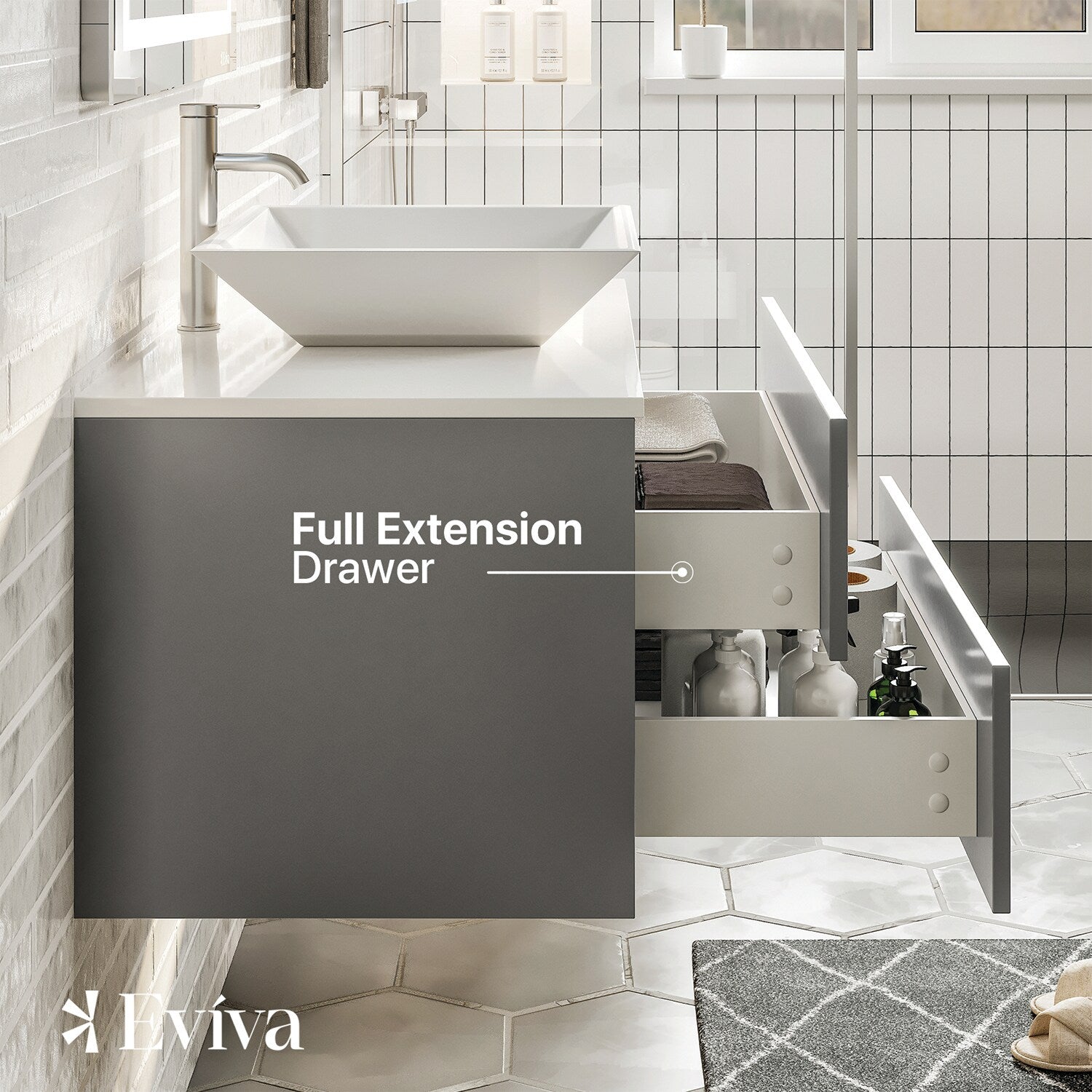 Sleek and space-saving, the Eviva Totti Wave 30-inch wall-mount vanity pairs a gray MDF cabinet with a white Glassos glass countertop and center-set porcelain vessel sink. Two soft-close, full-extension drawers and brushed metal handles deliver modern function and style for contemporary baths.